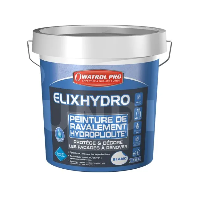 ELIXHYDRO est une peinture garnissante et opacifiante qui masque les imperfections sans reprise. Elle adhère parfaitement même sur les fonds farinants et/ou légèrement dégradés grâce à la Technologie Hydro PLIOLITE® ESB (emulsified binding system).
