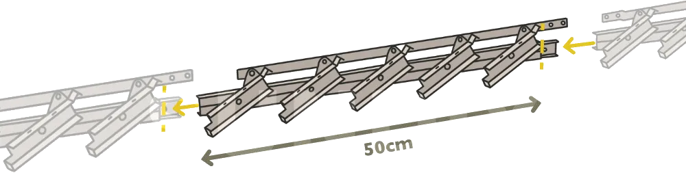 Distance entre les supports : À supposer que le mécanisme est fixé entre deux poutres, la distance entre ces deux poutres doit être égale à la longueur des lames + 35mm : 2 X 15mm (largeur du corps de mécanisme) + 5mm de jeu.
