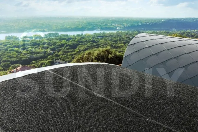 - Posez le lé suivant, bord autocollant sur bord autocollant, en respectant le sens d’écoulement de l’eau, de sorte que l’eau s’écoule de bas en haut du toit. Assurez-vous que le lé supérieur passe par-dessus le lé du dessous. Une fois en place, retirez les bandes pelables et appliquez une pression manuelle sur les recouvrements pour améliorer le collage.