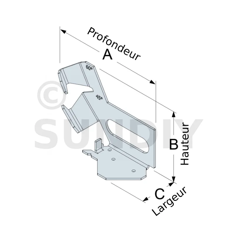 - Ce gabarit trouve son utilité avec les gammes de vis filetage total ou vis sarking car l’angle de vissage est majoritairement à 45° ou à 60°. Il peut toutefois être utilisé pour n’importe quel type de vis de longueur supérieure à 100 mm pour une configuration à 45°, et supérieure à 140 mm pour une configuration à 60°.