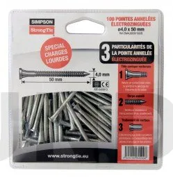 Les pointes annelées électrozinguées CNA sont préconisées pour les assemblages structurels des connecteurs Simpson Strong-Tie. Tous nos essais ont été réalisés avec ce type de pointes. Pour plus de traçabilité sur les chantiers, elles sont estampillées ≠, une garantie de qualité sans équivalent.