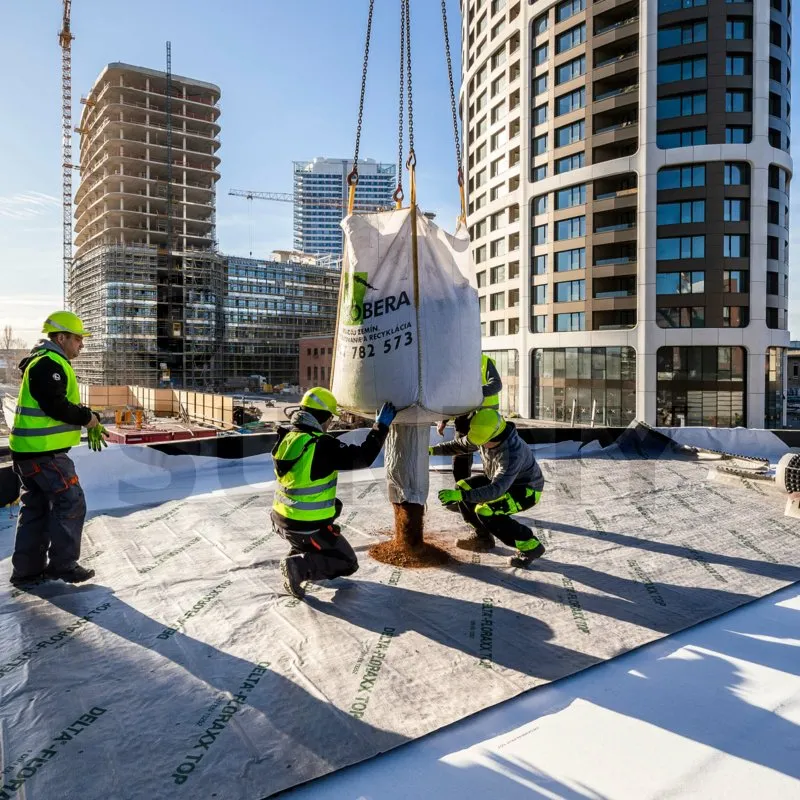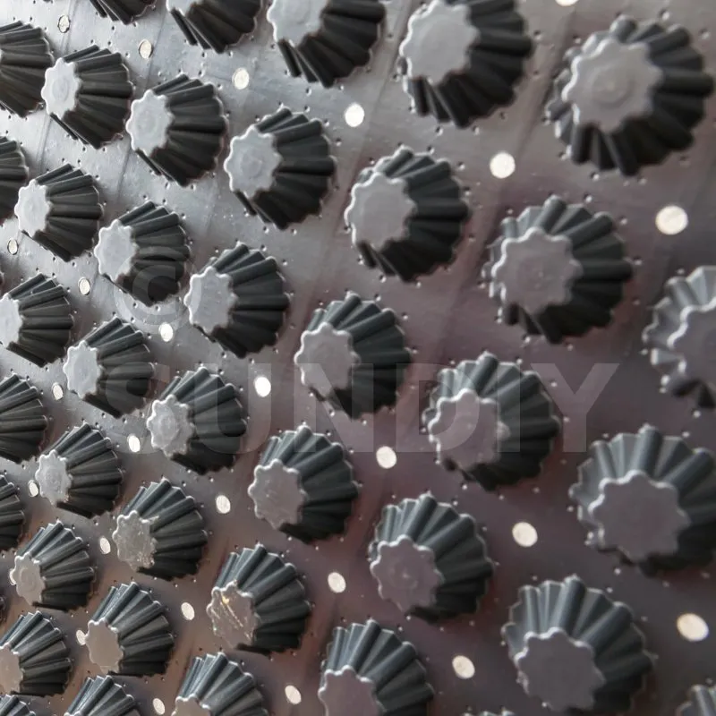 - Les alvéoles octogonales permettent de stocker jusqu’à 7 litres/m² d’eau, l’excédent d’eau s’écoule ensuite sous la membrane via les perforations entre les alvéoles. La membrane est écologique et résistante aux produits chimiques, aux bactéries, aux substances alcalines et aux racines.