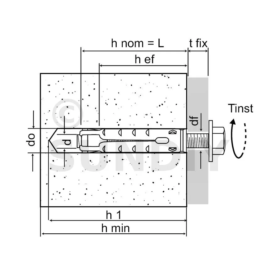 | Références | Référence | Ø perçage [d0] [mm] | Prof. min. de perçage [h1] [mm] | Ø perçage dans pce à fixer (au travers) [df] [mm] | Couple de serrage [Tinst] [Nm] | Prof. ancrage [hef] [mm] | Ep. mini du support [hmin] [mm] |