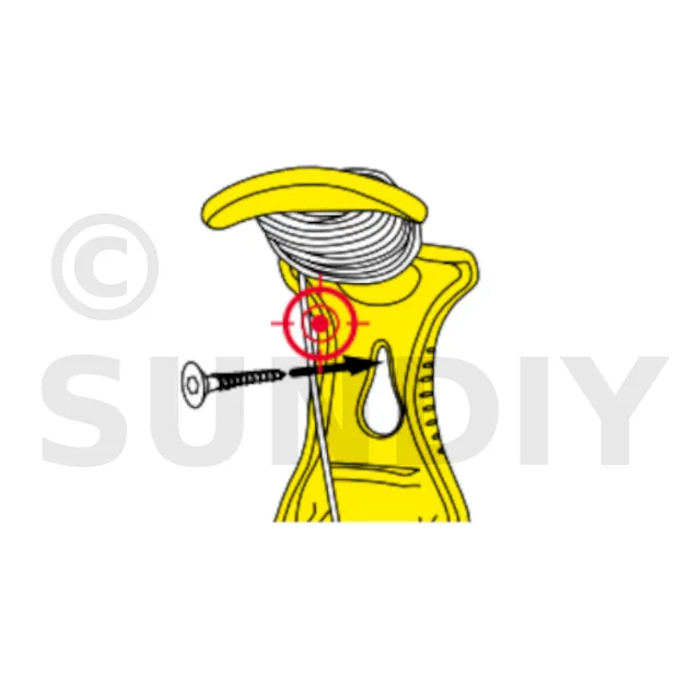 - d’une monture en polymère perforée de couleur jaune vif. La perforation permet de le fixer à une vis, des clous ou autres et de libérer la main de l’utilisateur, tandis que la couleur facilite son identification sur le chantier.
