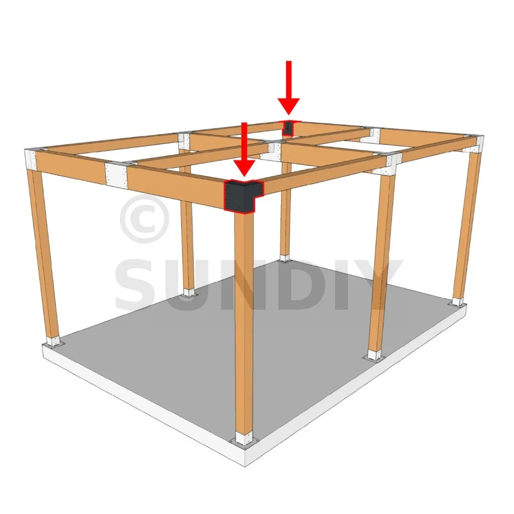 Il est utilisé dans un angle extérieur. Ce connecteur va permettre de raccorder une grosse poutre 240x120mm perpendiculairement à une poutre 120x120mm, le tout étant supporté par un poteau vertical 120x120mm.