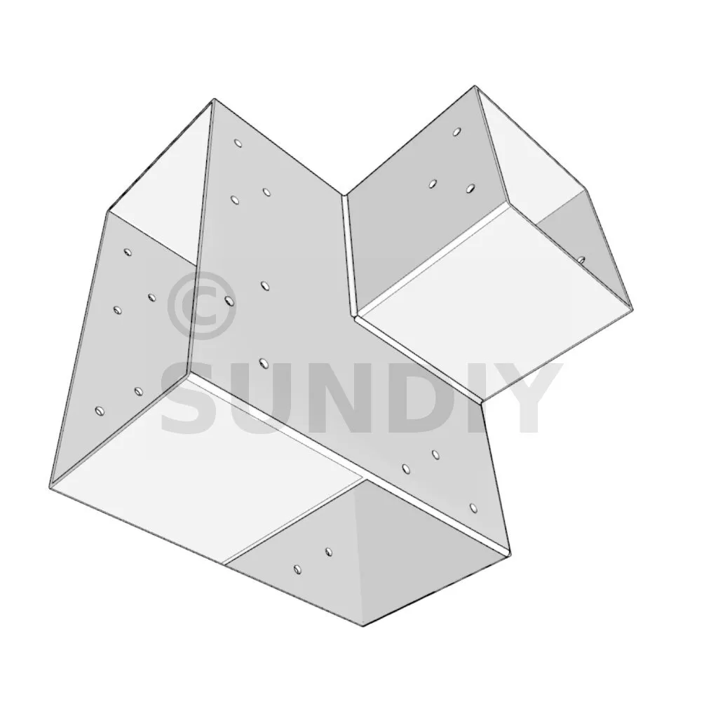 Il est utilisé dans un angle extérieur. Ce connecteur va permettre de raccorder une grosse poutre 240x120mm perpendiculairement à une poutre 120x120mm, le tout étant supporté par un poteau vertical 120x120mm.