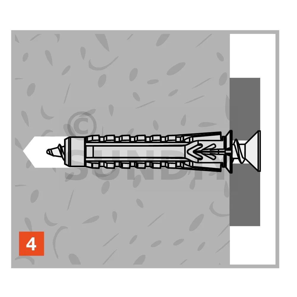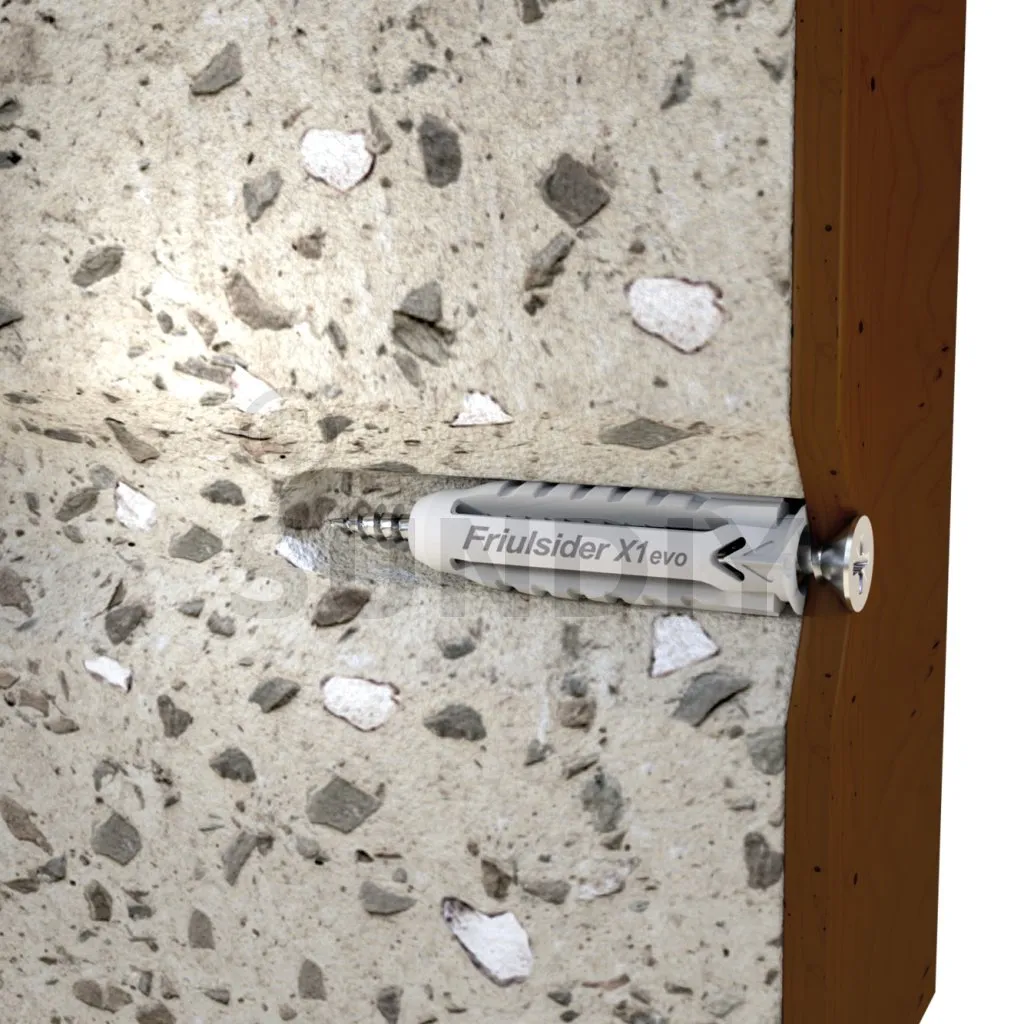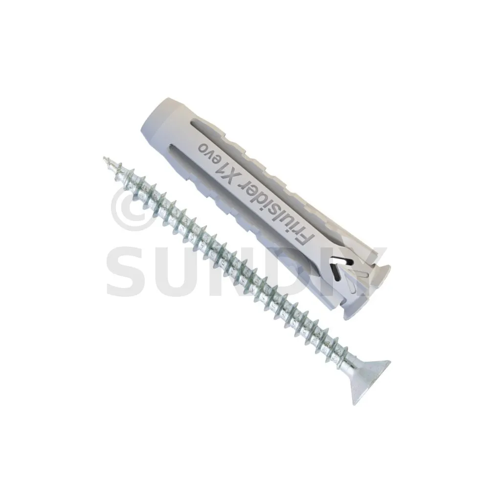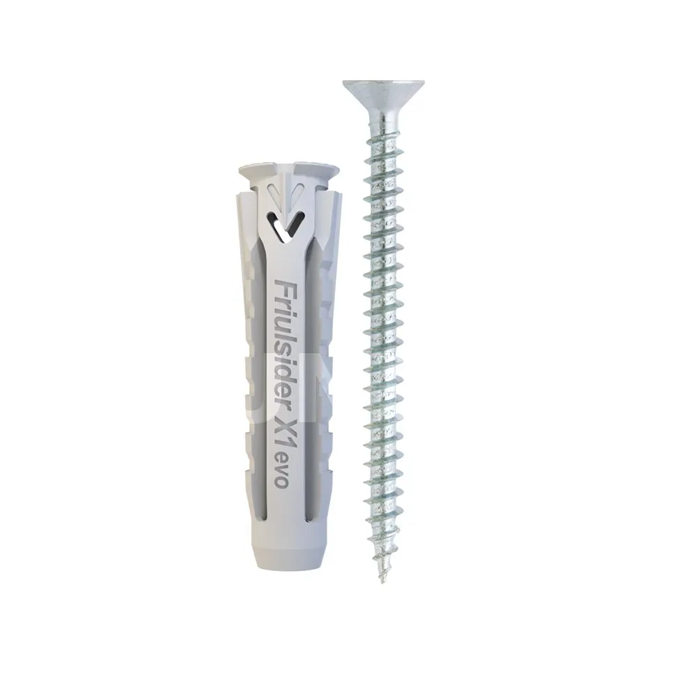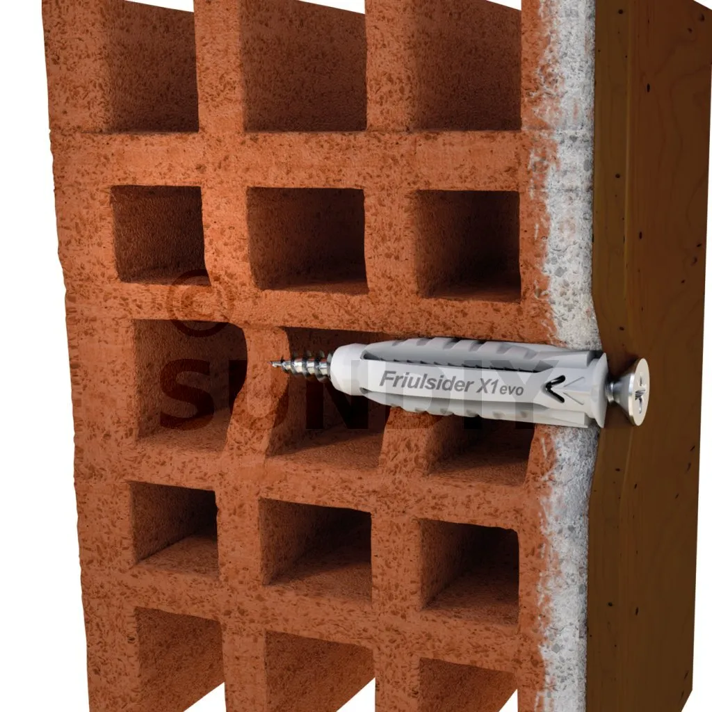 La cheville nylon universelle X1 evo, permet une fixation optimale d’éléments sur tous types de supports plein ou creux, notamment sur plaque de plâtre. Avec tous types de vis: vis filetage bois, vis filetage pas métrique. Avec un maintien large et stable grâce au 4 segments formant une rosace en arrière face du support lors de la pose.