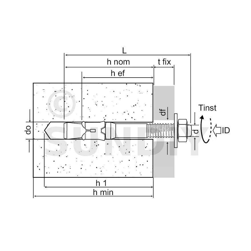 | Réference produit | Dimensions [ØxL] [mm] | Ø perçage [d0] [mm] | Prof. min. de perçage [h1] [mm] | Ø perçage dans pce à fixer (au travers) [df] [mm] | Ouverture de clé sur plat [SW] [SW] [mm] | Couple de serrage [Tinst] [Nm] | Prof. ancrage [hef] [mm] | Ep. mini du support [hmin] [mm] | |