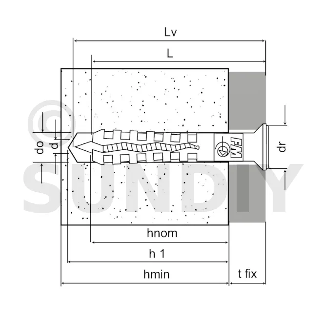 | Références | Réference produit | Dimensions [d0xL] [mm] | Ep. max élément à fixer [tfix] [mm] | Profondeur mini perçage [h1] [mm] | Profondeur d’ancrage nominale [hnom] [mm] | Ep. mini support [hmin] [mm] | Ø vis [d] [mm] | Longueur vis [Lv] [mm] | Ø colerette [dr] [mm] |