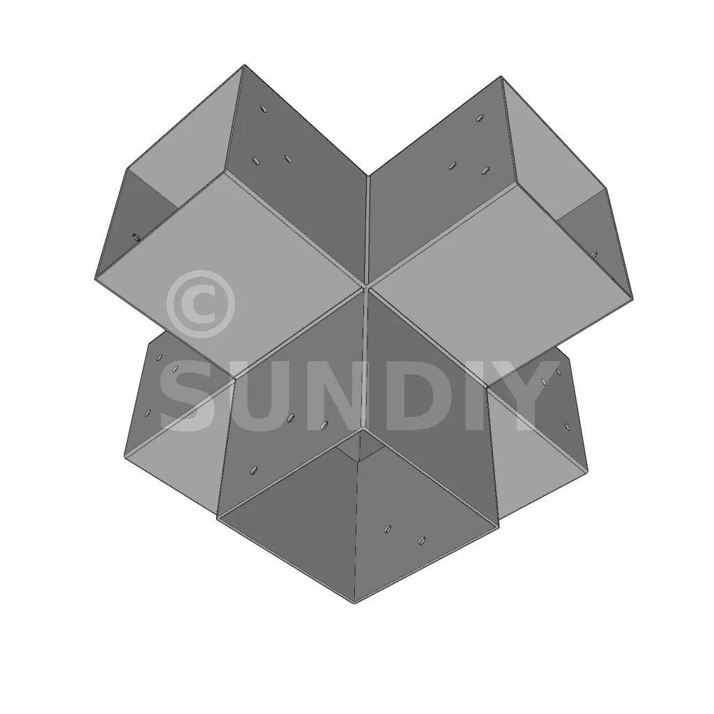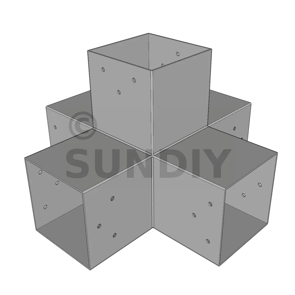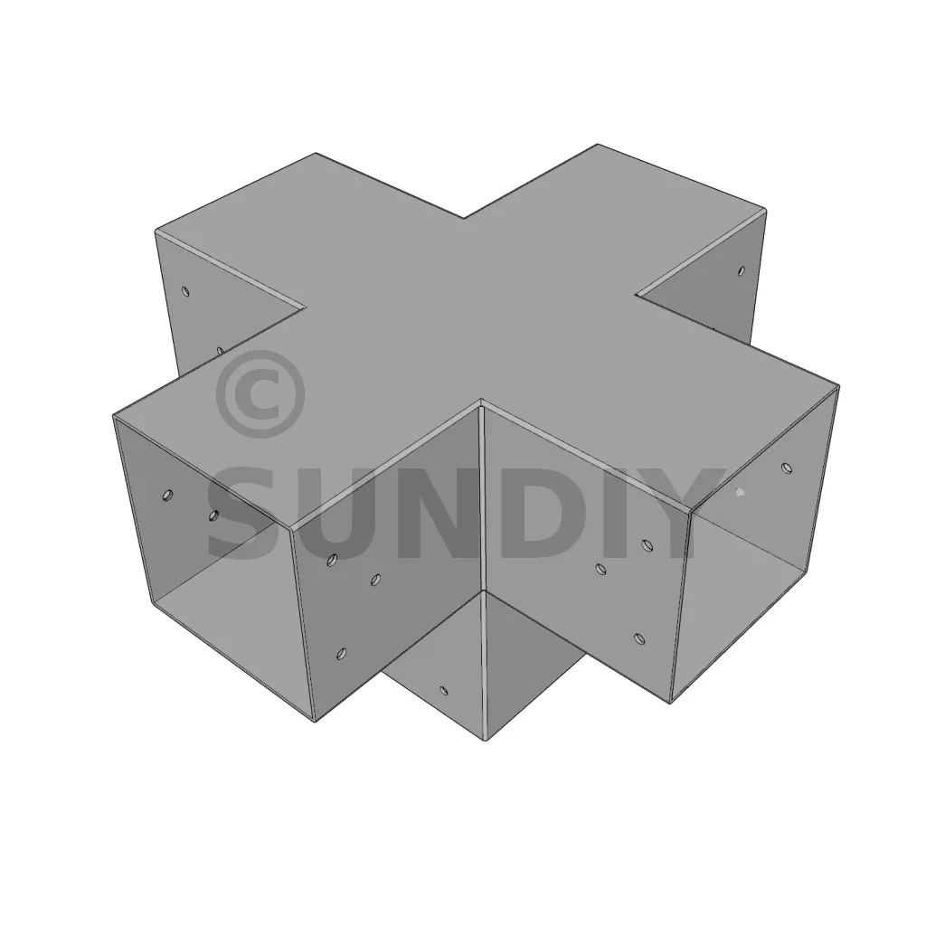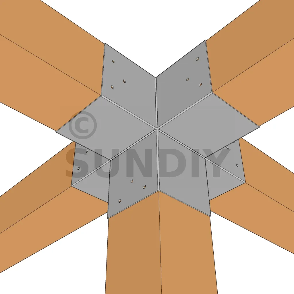 Il permet de raccorder deux poutres 120x120mm perpendiculairement à une autre poutre 120x120mm, le tout étant supporté par un poteau vertical de 120x120mm.