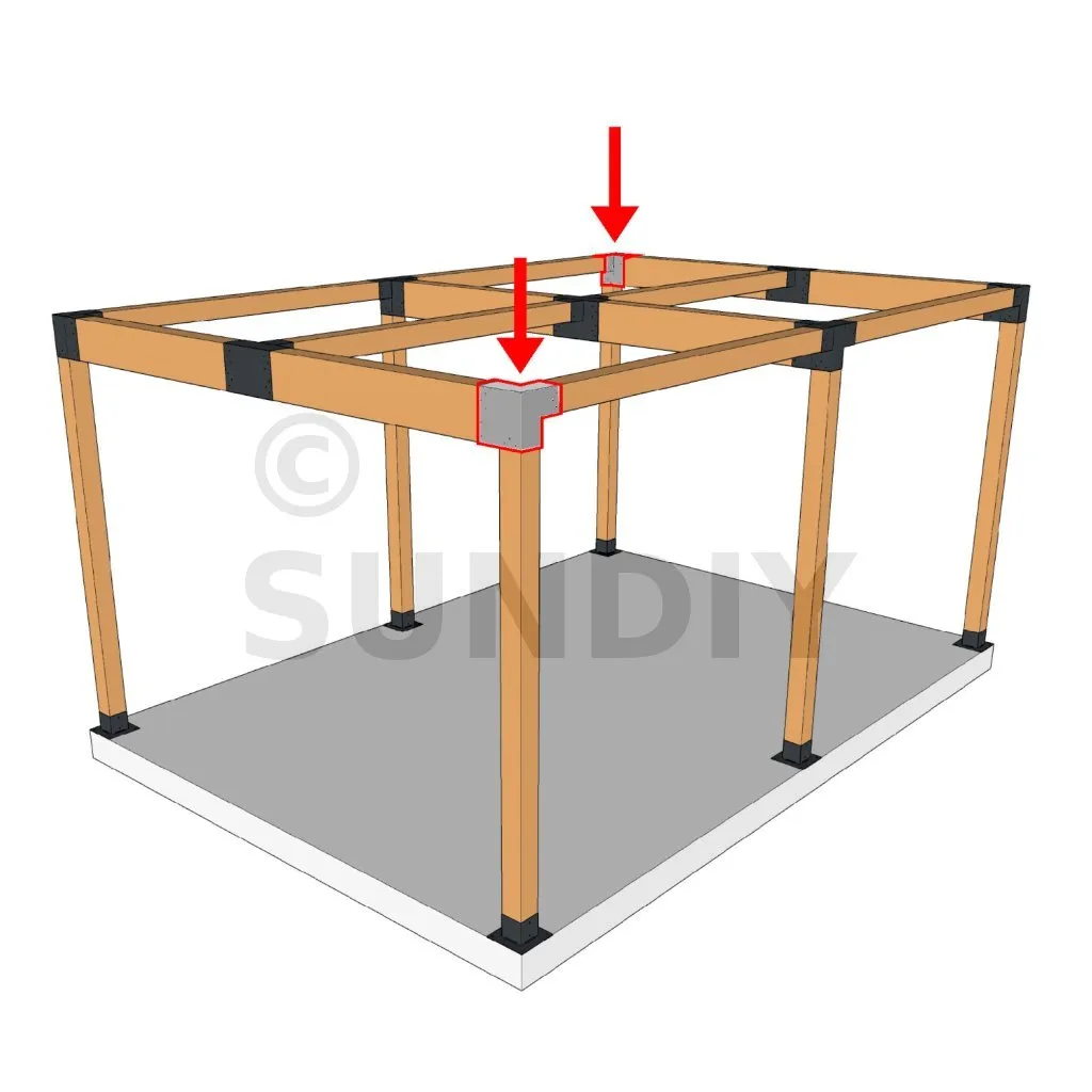 Il est utilisé dans un angle extérieur. Ce connecteur va permettre de raccorder une grosse poutre 240x120mm perpendiculairement à une poutre 120x120mm, le tout étant supporté par un poteau vertical 120x120 mm.