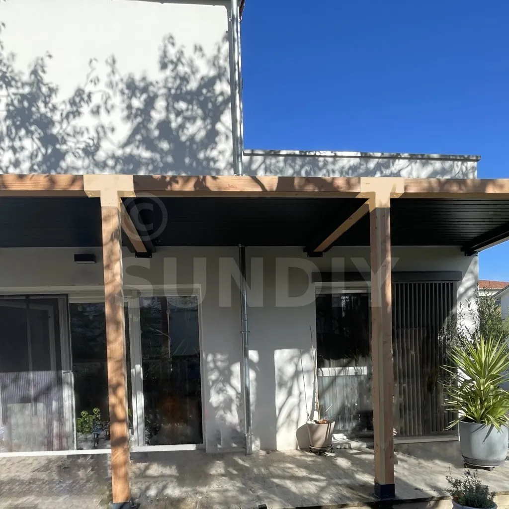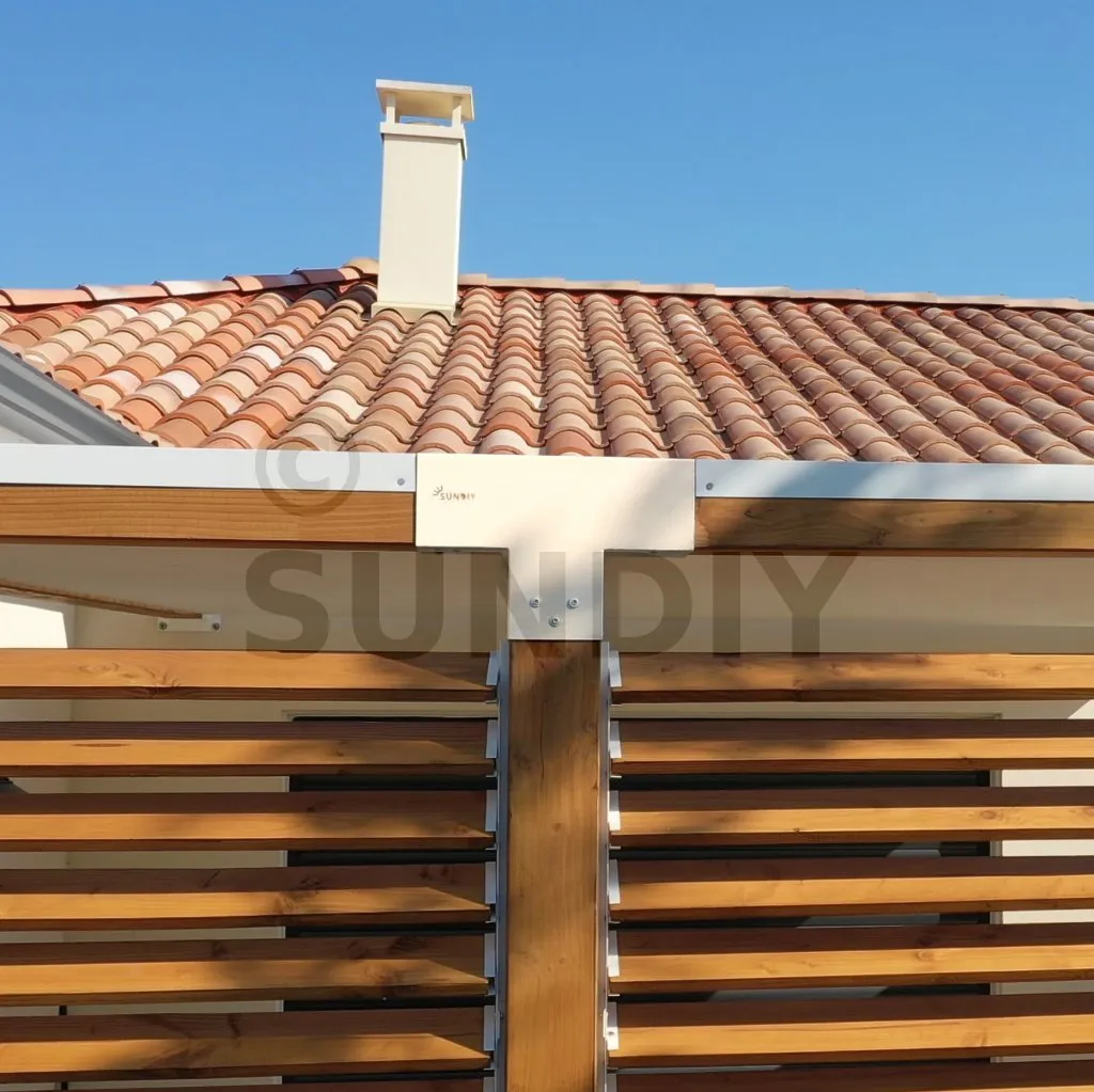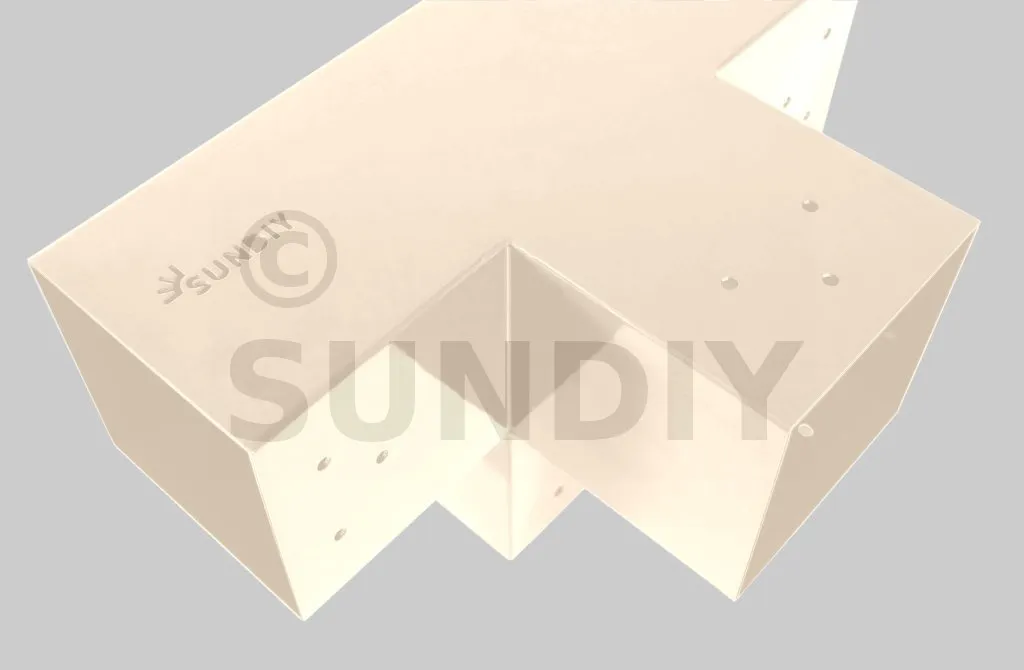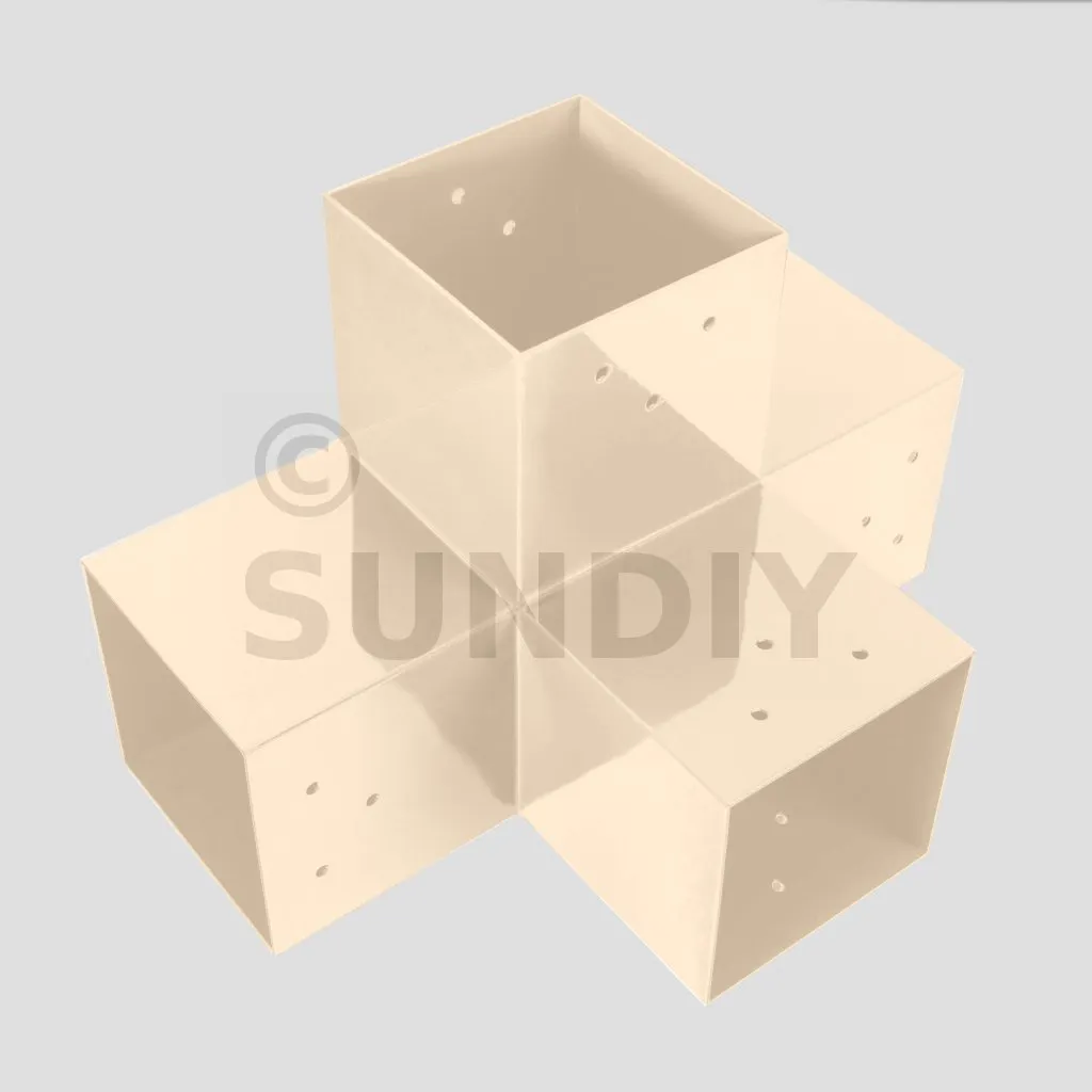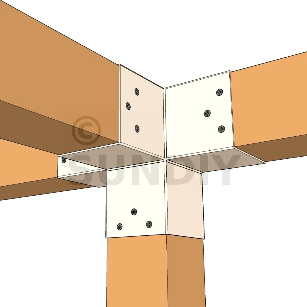 Il permet de raccorder une poutre de 90x90mm perpendiculairement à un chevron de 90x90mm, le tout étant supporté par un poteau vertical de 90x90mm.