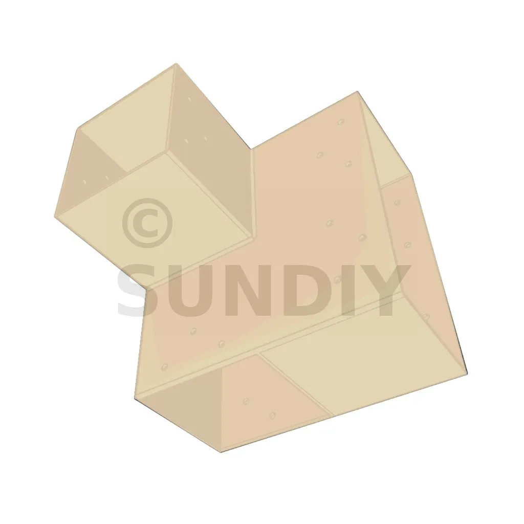 Il est utilisé dans un angle extérieur. Ce connecteur va permettre de raccorder une grosse poutre 240x120mm perpendiculairement à une poutre 120x120mm, le tout étant supporté par un poteau vertical 120x120 mm.