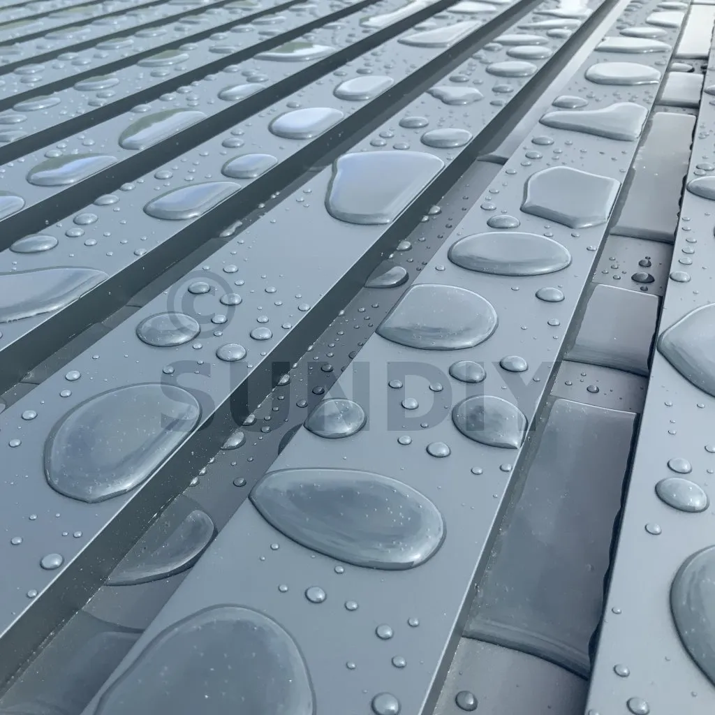 L’eau est collectée dans la rigole intégrée à la lame. Sous l’effet de la gravité, elle s’écoule ensuite de part et d’autre à chaque extrémité de la lame. Si vous recherchez une étanchéité totale, nous vous conseillons d’ajouter des chenaux qui viendront récupérer l’eau à chaque extrémité et la rediriger vers l’extérieur.
