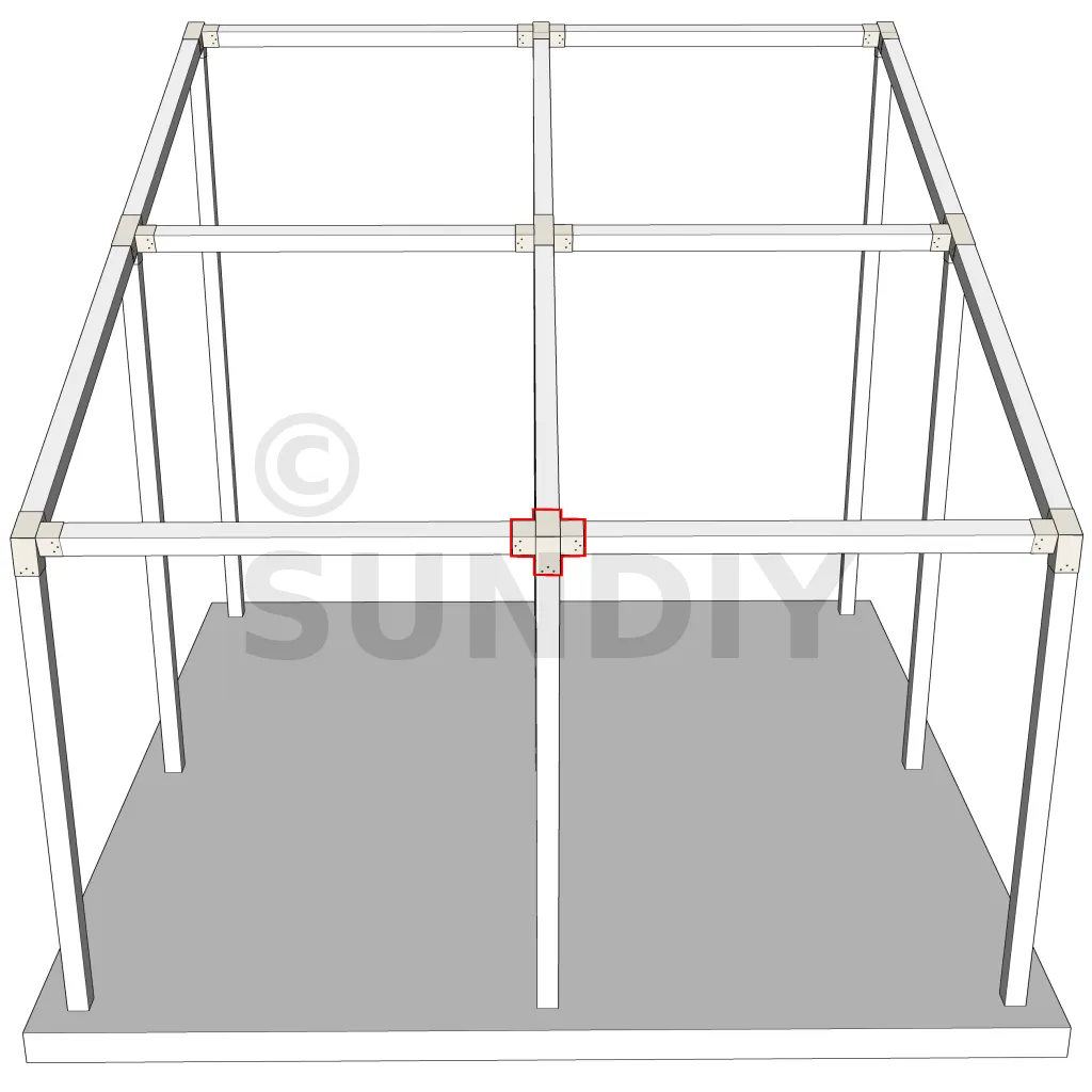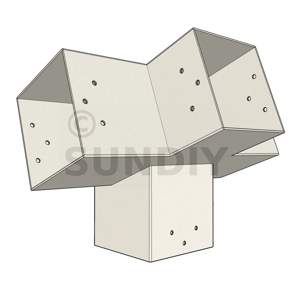 Connecteur d’angle intérieur à quatre directions conçu pour l’assemblage de poutres en section 120x120 mm avec un chevron de même section incliné à 20°. Il assure la jonction structurelle entre les éléments horizontaux, le chevron incliné et un poteau porteur vertical en 120x120 mm.
