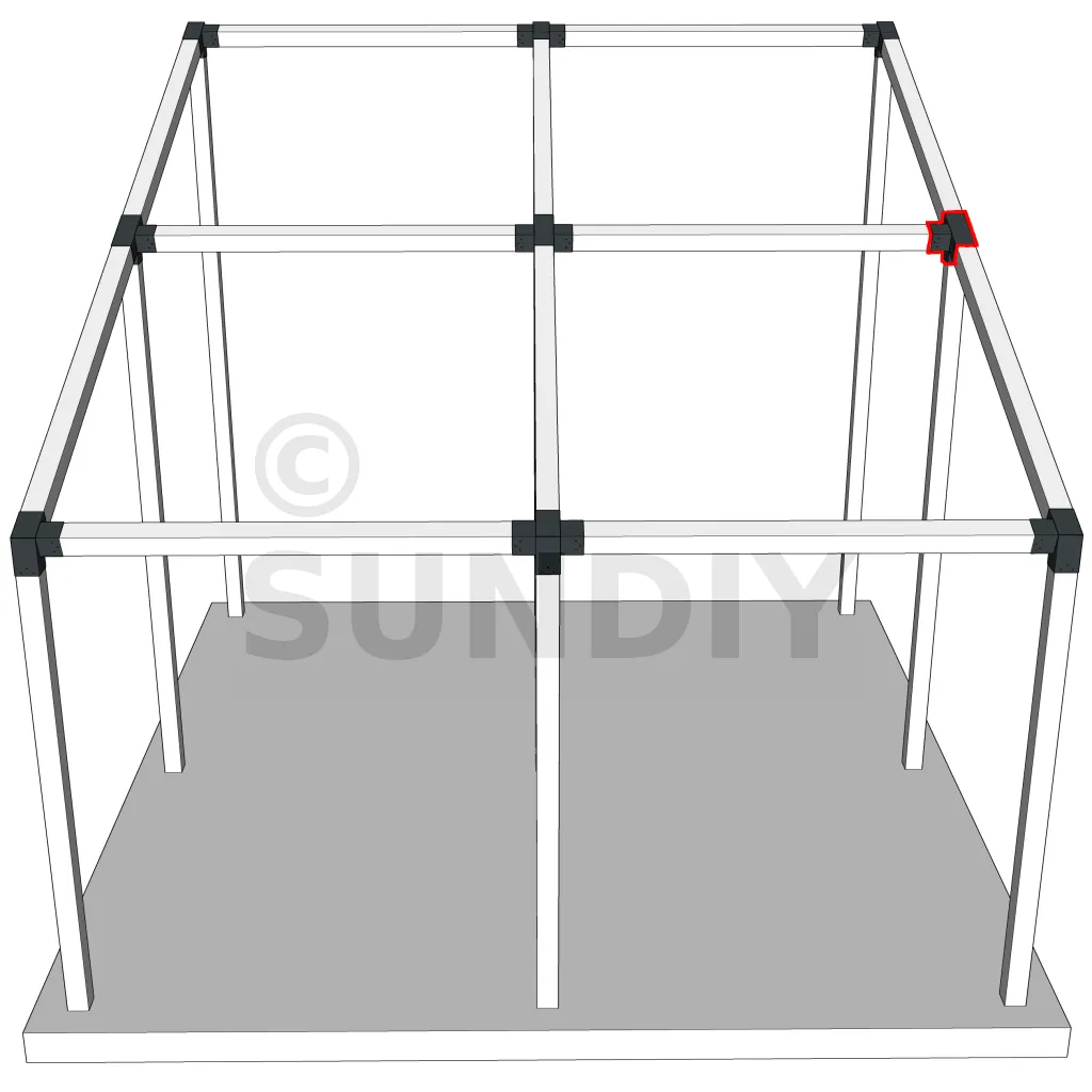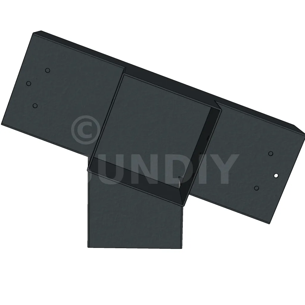 Connecteur d’angle intérieur à quatre directions, conçu pour l’assemblage de deux poutres en section 120x120 mm formant un angle de 20° avec un poteau vertical de même section. Il assure une liaison structurelle rigide et orthogonale à mi-hauteur, garantissant la stabilité de l’ensemble.