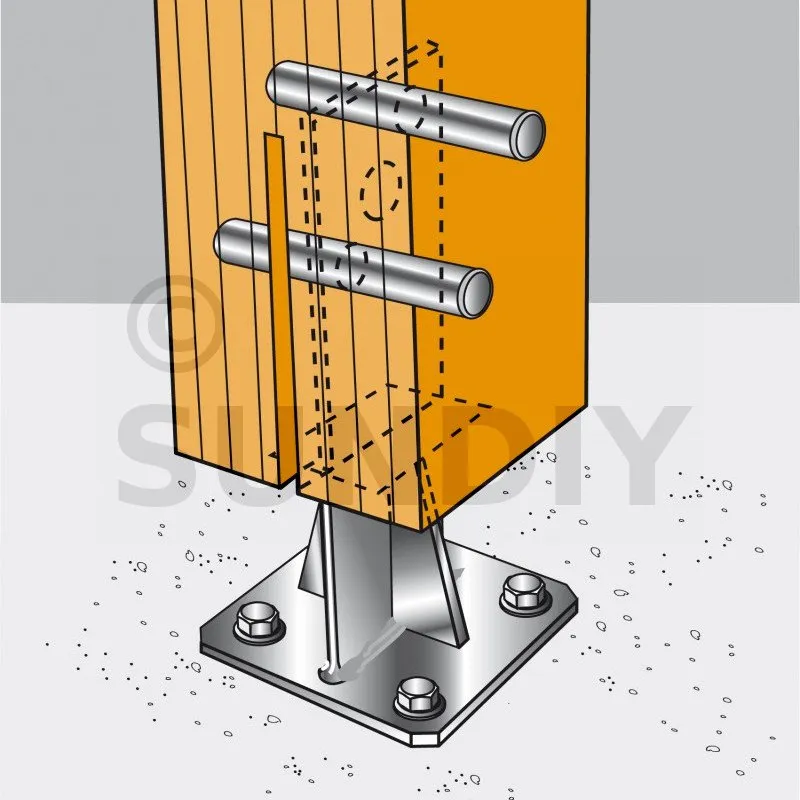- Connexion bois sur support rigideSur poteau : 2 broches Inox Ø12 ou Ø16 ou Boulons inox Ø 12 mm ou 16 mm suivant perçages ; sur béton : 4Ø12 (goujons BOAX-II M12-104/5 A4 ; tige filetée M12) ; sur acier : Boulons inox Ø12