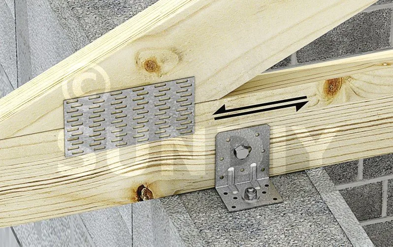 Dans le cas d’un déplacement calculé de la ferme de plus de 6 mm, il faut alors réaliser un appui glissant. Le glissement est autorisé par le trou oblong situé sur nos équerres (source DTU 31.3, P3/5.3.3)