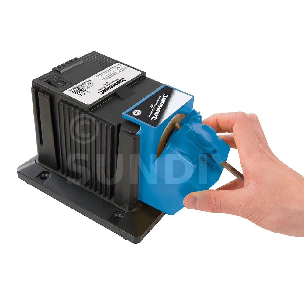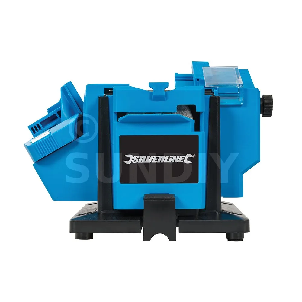 Appareil spécialement conçu pour réaliser l’affûtage de forets en acier HSS (acier rapide), burins, couteaux, ciseaux, fers de rabots, et autres lames. Comprend des gabarits afin d’obtenir un réglage de l’angle d’affûtage d’une grande précision. Garantit un affûtage rapide et soigné. Pour mèches en acier HSS (acier rapide) de 3 à 13 mm de diamètre et pour lames de 6 à 51 mm de largeur. Polyvalent et facile d’utilisation. Disques de meulage de rechange disponibles.
