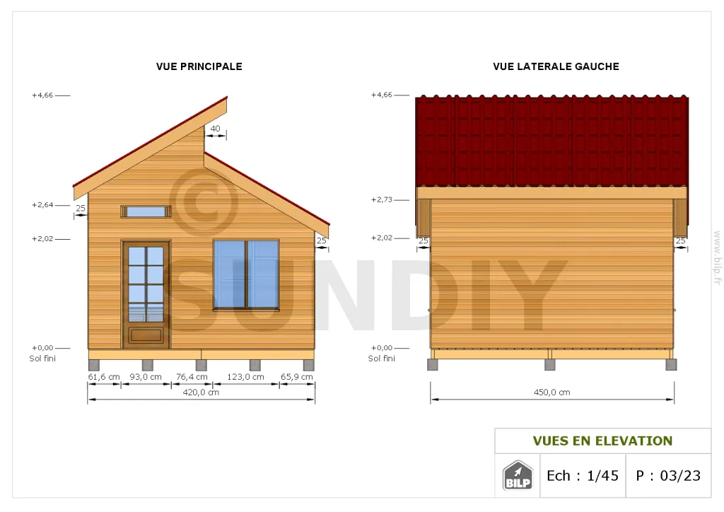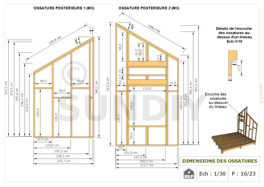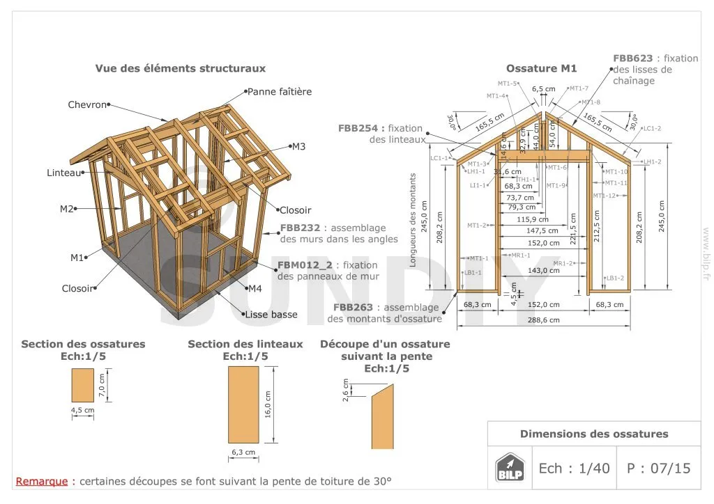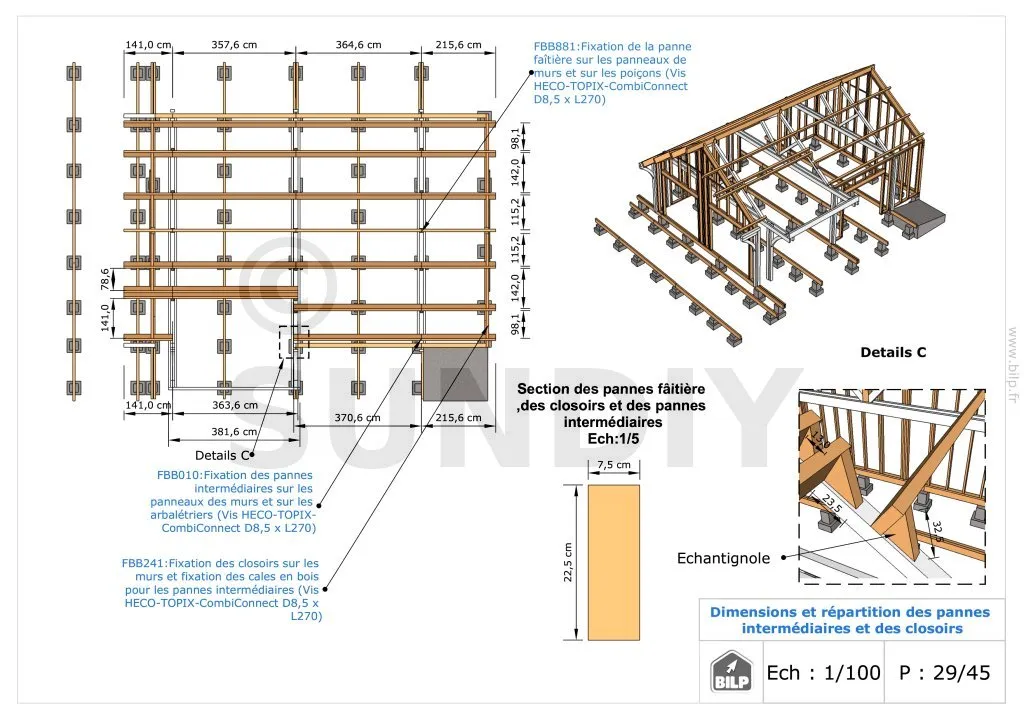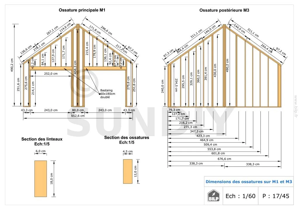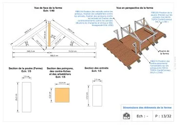 Les plans de structure à l’échelle sont faciles à lire et à comprendre. Ils vous permettrons de réaliser vous-même la structure de votre cabane. Les détails de réalisation sont indiqués. Nous calculons et optimisons les dimensions et les sections de pièces de bois.