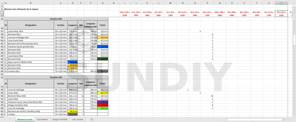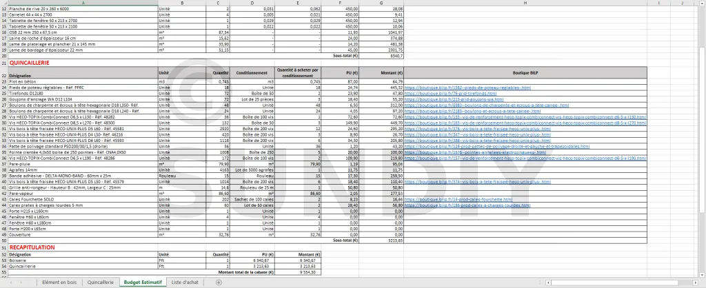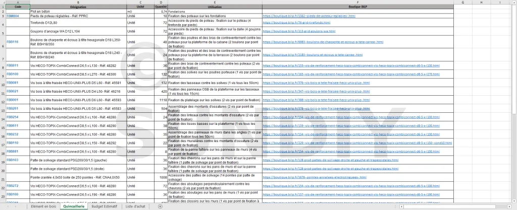 La liste de matériaux vous permet d’estimer le prix final de votre cabane, et surtout de faire vos achats en toute sérénité, sans rien oublier. Vous ne courrez plus entre votre chantier et le marchand de matériaux.