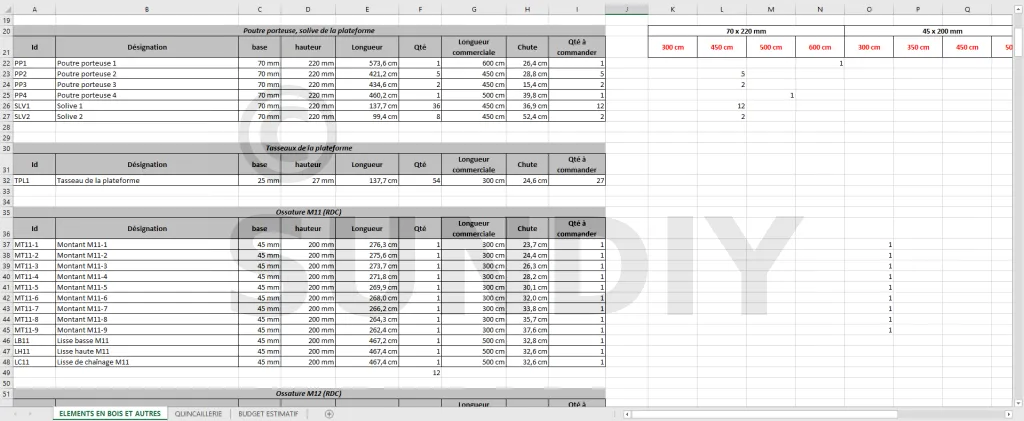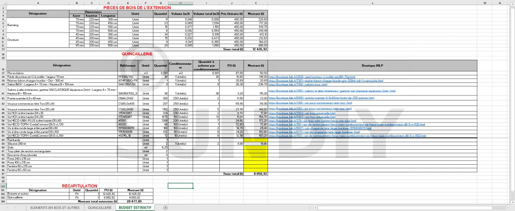 Cette liste peut être envoyée directement à votre marchand de matériaux pour réalisation d’un devis. La liste est au format EXCEL. Vous pouvez donc l’éditer, la modifier, ajouter vos informations, etc.