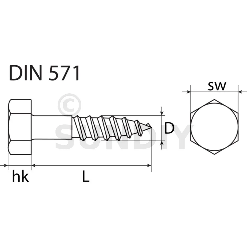 DIN 571 est une norme allemande pour une vis à bois hexagonale. Les vis DIN (Deutsches Institut für Normung) sont des standards techniques reconnus en Allemagne et internationalement pour leur précision et leur qualité.