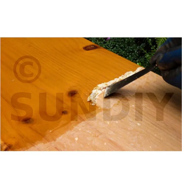 - Enlever la pâte obtenue avec une spatule ou une brosse à chiendent en nylon (selon dureté du bois). Sur bois fragile ou sur support intérieur pour un aspect soigné, préférer une brosse en laiton doux. Rincer le DSP 800 à l’aide d’une éponge humide imbibée d’eau tiède (attention à ne pas relever la fibre du bois, si besoin égrener avec du papier abrasif de grain moyen à fin).