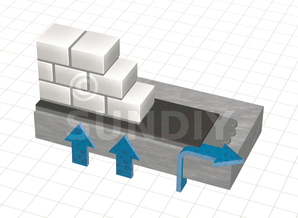 - Ouvrages en maçonnerie (DTU 20.1) : La bande DELTA®-PROTEKT est placée entre deux couches de mortier de ciment, à une hauteur d’au moins 15 cm au-dessus du niveau final du sol extérieur.
