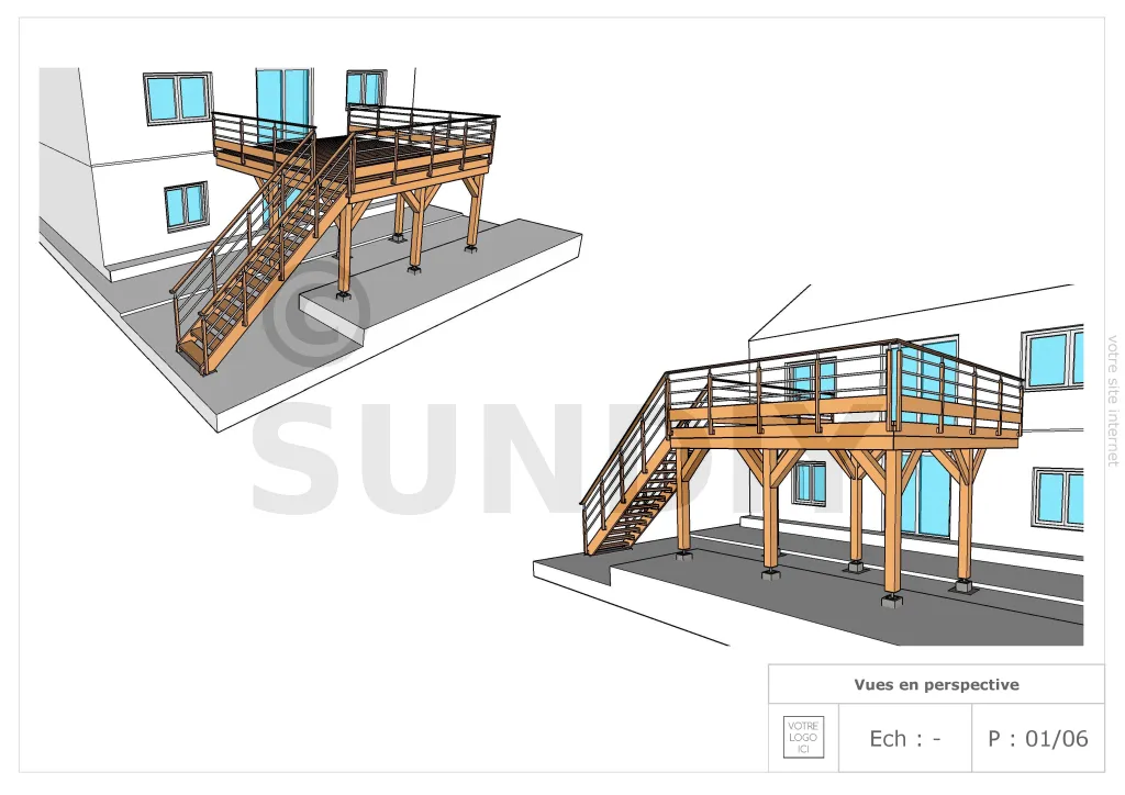 - Les plans de structure, les plans détaillés de la réalisation, une liste des matériaux avec un devis estimatif des coûts, une animation 3D de votre future terrasse. Pour ce type de prestation, nous vous proposons la prestation complète de plan sur mesure
