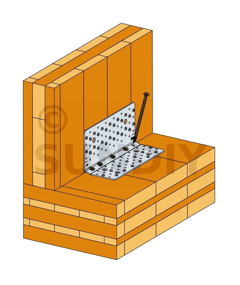 3- Insérer ensuite les vis filetage total dans les perçages proches du pli à un angle d’environ 70° (l’utilisation d’un gabarit est recommandé pour plus de rapidité et de précision).