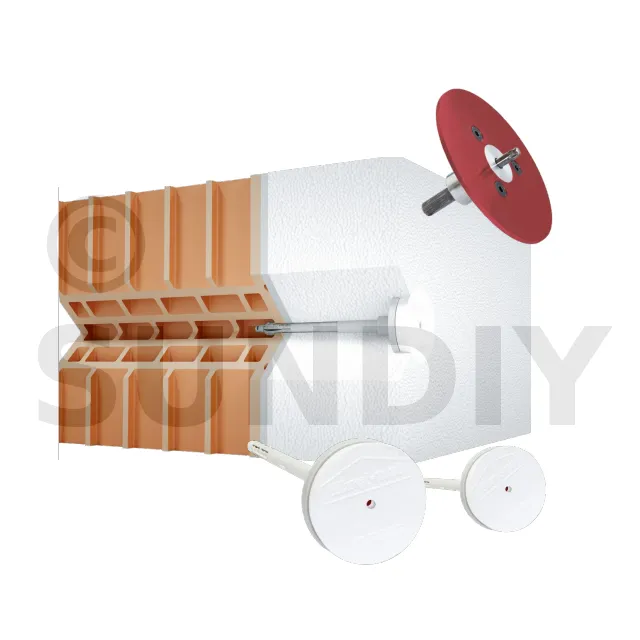 - Disque polystyrène : L’inclusion de disques polystyrène avec les connecteurs permet d’accélérer le travail, d’éliminer les ponts thermiques et d’améliorer l’esthétique de la surface extérieure.