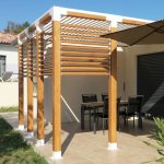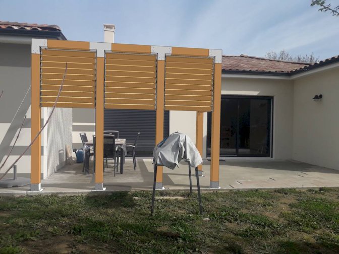 – Composition de la structure : Poteau en 12x12 lamellé-collé, toit en lames alu blanc et brise vue en lames bois 20mm