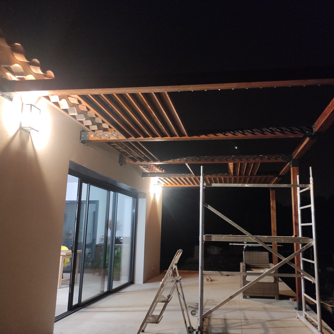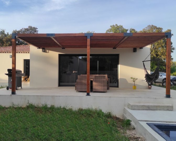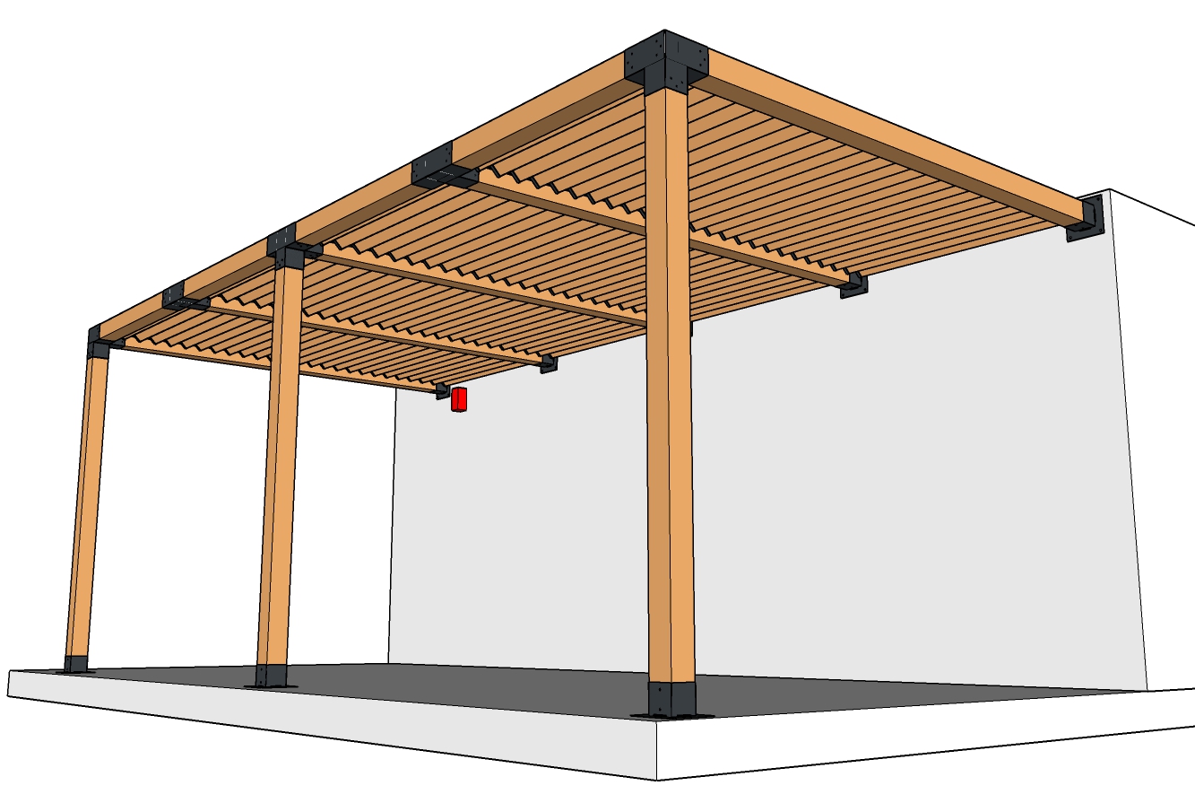 La pergola bioclimatique de Benjamin - Lames en bois, poteaux bois 12x12 et connecteurs