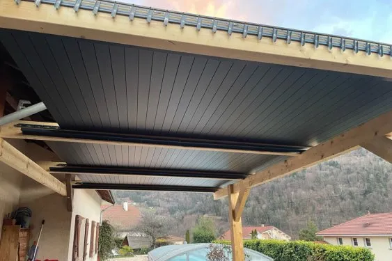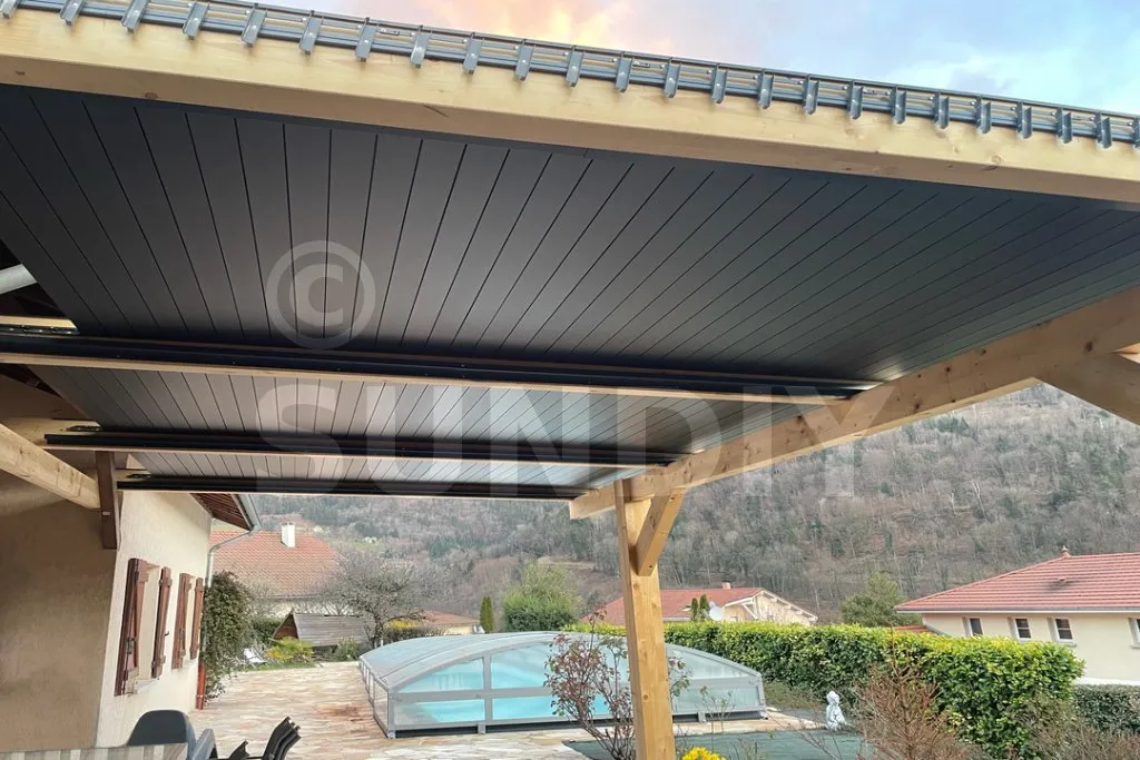 Composition : Une structure en bois lamellé collé avec des lames alu, mécanisme 20 mm gris anthracite.