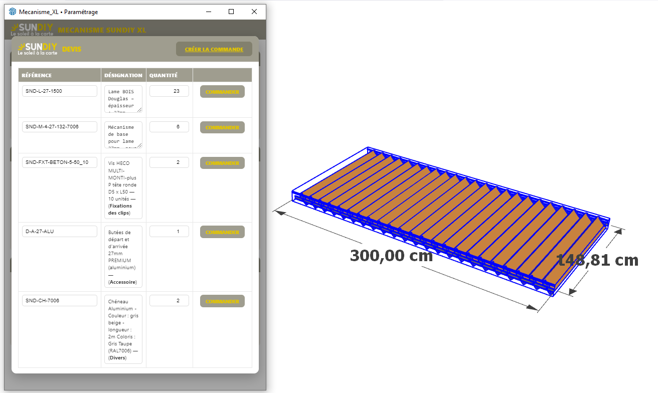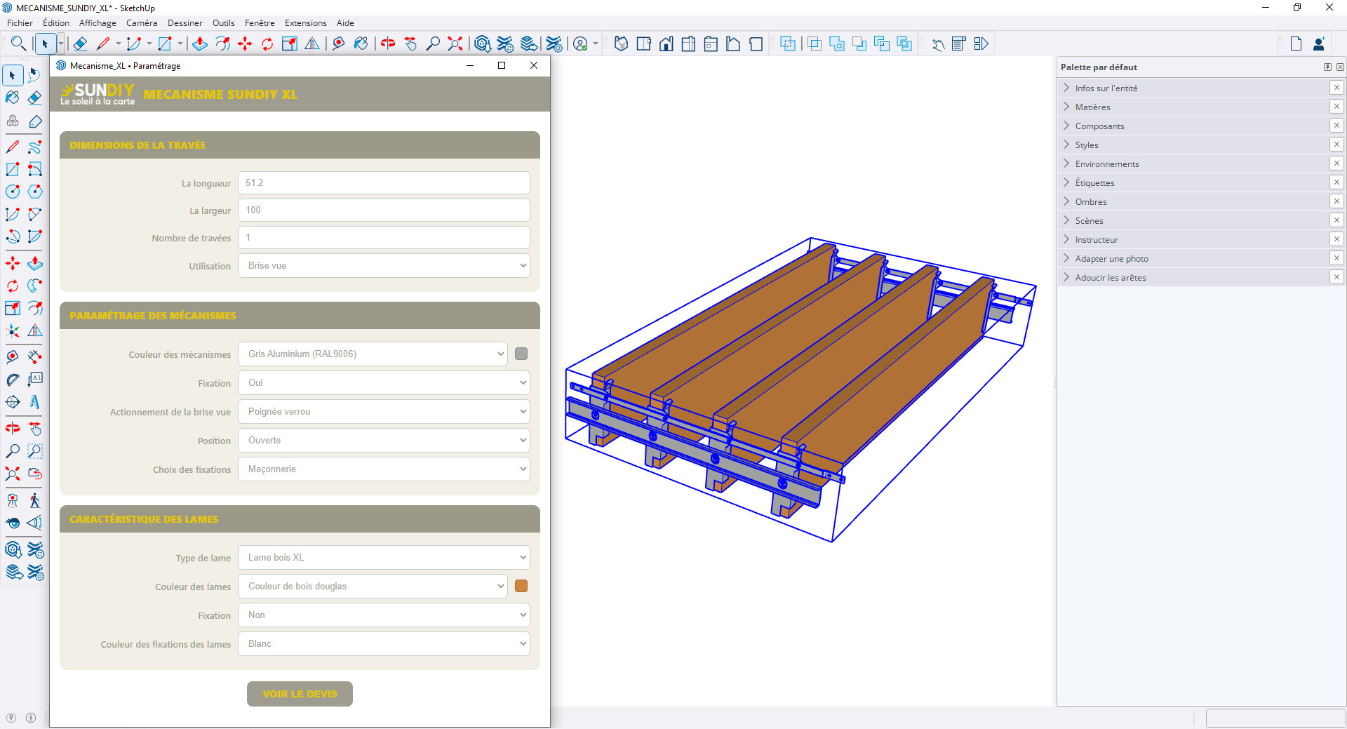 Modéliser une travée à lames orientables, ce n’est pas juste faire un faire un joli rendu 3D. Il faut choisir le bon type de lames, la couleur, les mécanismes et l’actionnement, gérer les fixations et le support (bois, maçonnerie, acier), puis obtenir un récapitulatif d’achat fiable pour commander. Mécanisme SUNDIY XL s’occupe de tout ça automatiquement et vous permet de le faire directement dans SketchUp. Le plugin associé avec ce composant fonctionne avec les versions récentes de SketchUp (2022 à 2025).
