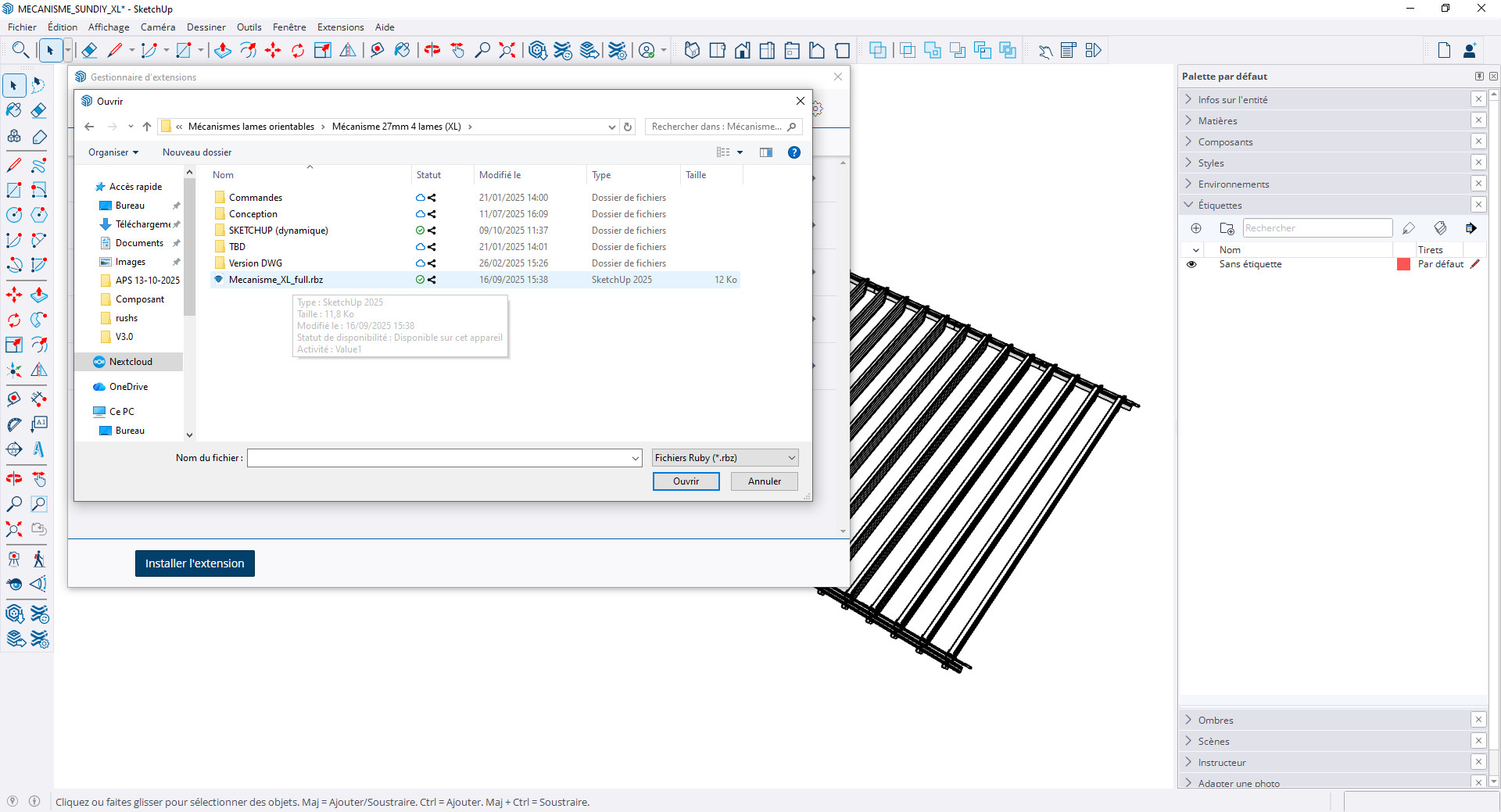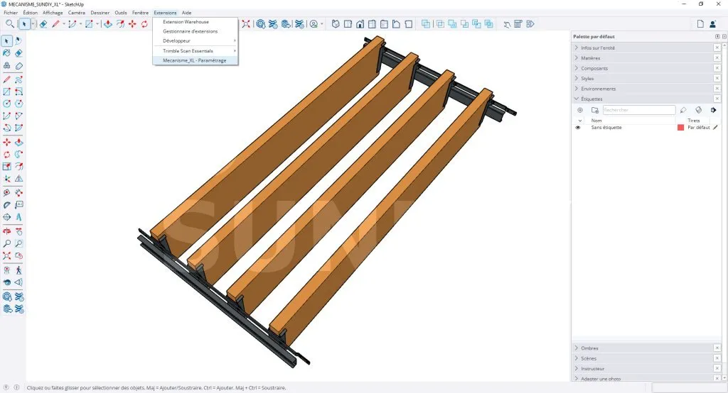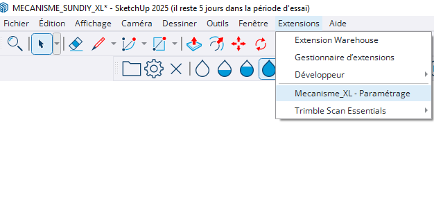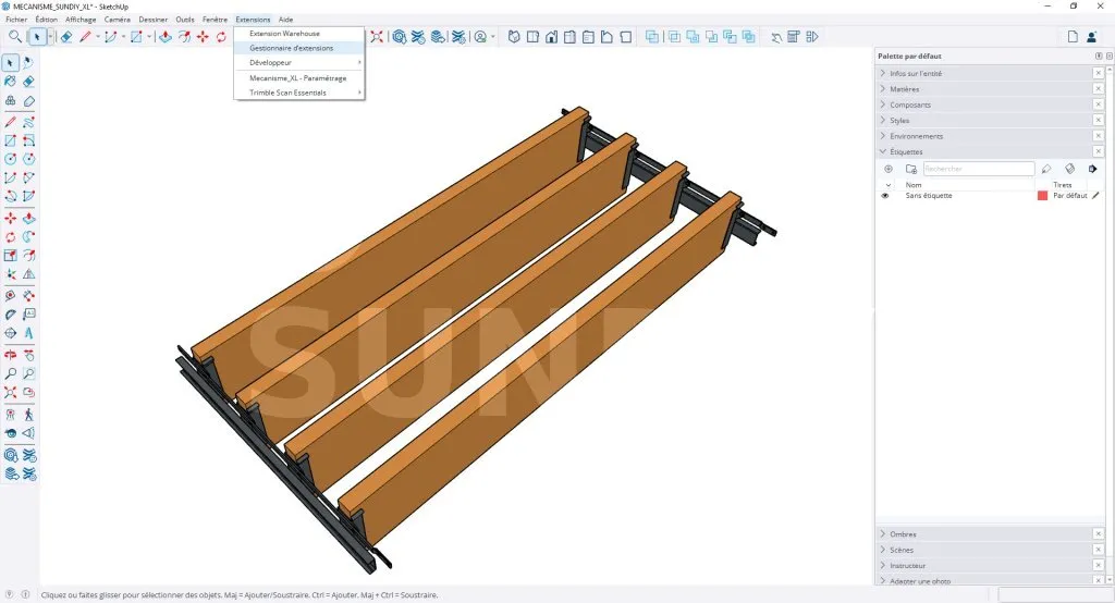 Pour utiliser cette version du composant dynamique Mécanisme SUNDIY XL, téléchargez le fichier Mecanisme_XL_full.rbz, puis suivez les étapes suivantes pour installer le plugin :