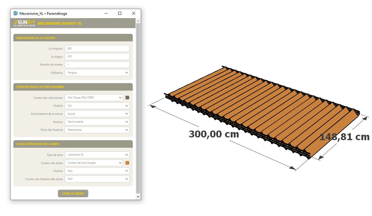 – La première concerne les dimensions d’une ou plusieurs travées. Dans le champ Utilisation, indiquez précisément Brise-vue ou Pergola : ce choix permet au plugin de vous proposer ensuite les types d’actionnement adaptés.