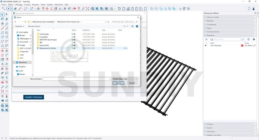 Une fois dans le Gestionnaire d’extensions, cliquez sur Installer une extension, ensuite allez dans le répertoire où se trouve le fichier Mecanisme_XL_full.rbz, puis cliquez sur ouvrir pour l’installer.