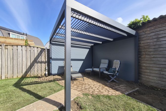 Le toit à persiennes SUNSHIELD Nautilus est entièrement fabriqué en aluminium. Les dimensions de cette toiture à lames sont de 350 x 350 cm, avec une hauteur de 240 cm et une hauteur de passage de 220 cm. En effet, la charpente du toit à persiennes a une hauteur de 20 cm. Les colonnes, avec évacuation d’eau intégrée, mesurent 11 x 11 cm.