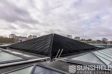 De chaque côté de la pyramide est placé un système de lamelles triangulaires. Chaque côté a une surface de 121 m2 . Comme dit, c’est énorme. Ces côtés sont actionnés indépendamment les uns des autres via un système de gestion du bâtiment. Chaque triangle est à son tour divisé en segments à actionner séparément. Donc un contrôle optimal de la position des lamelles.