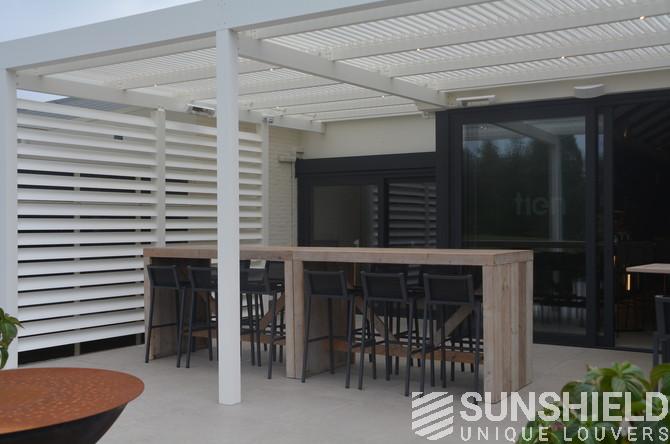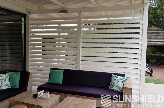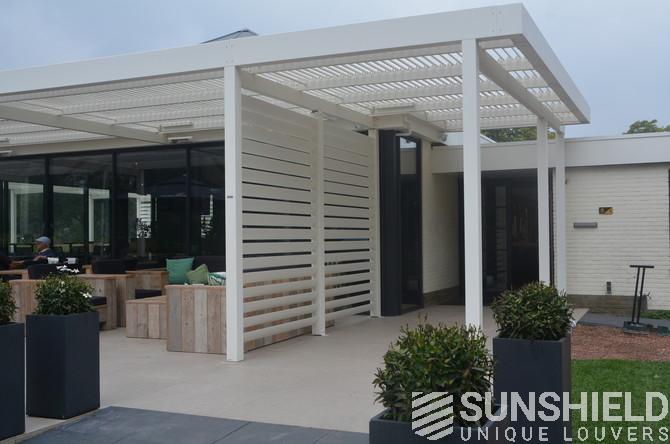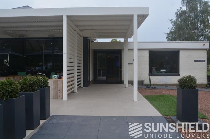 Accueil > Sunshield > Projets > Bâtiments > Mur à persiennes > Clôture à persiennes 150EL, Golfclub Helmond, NL