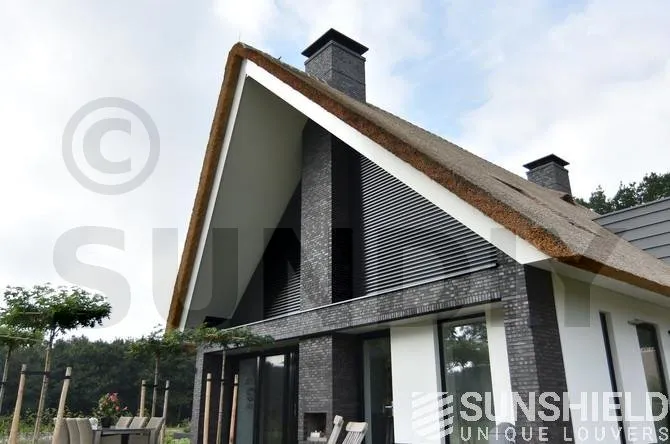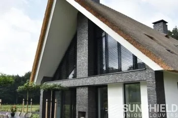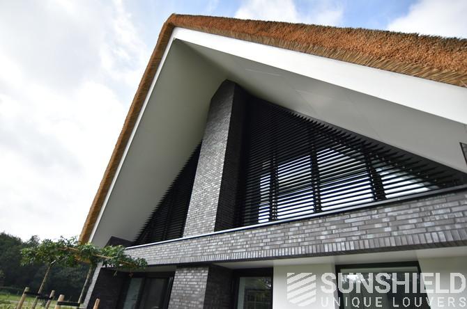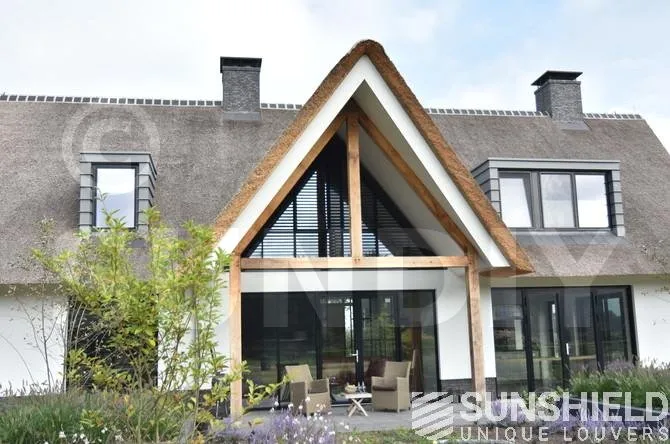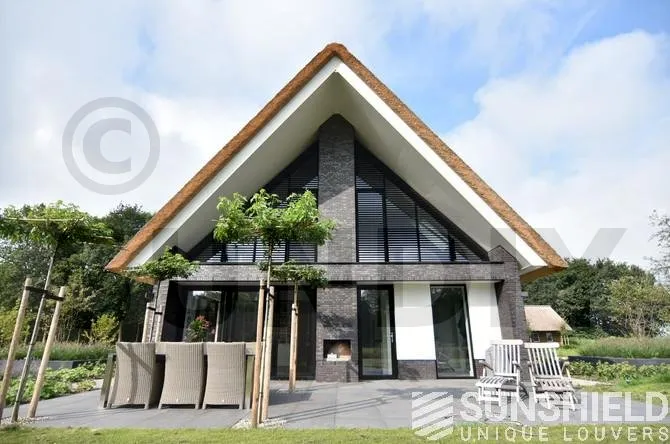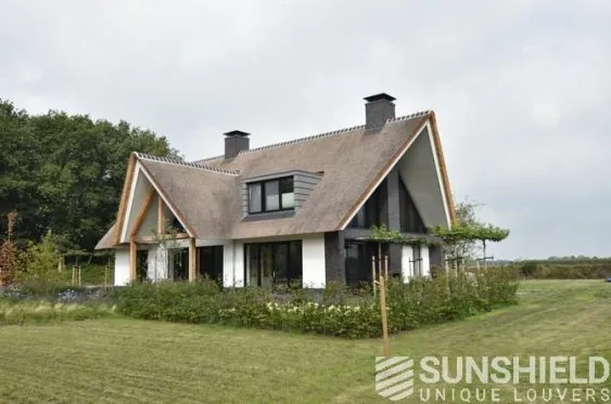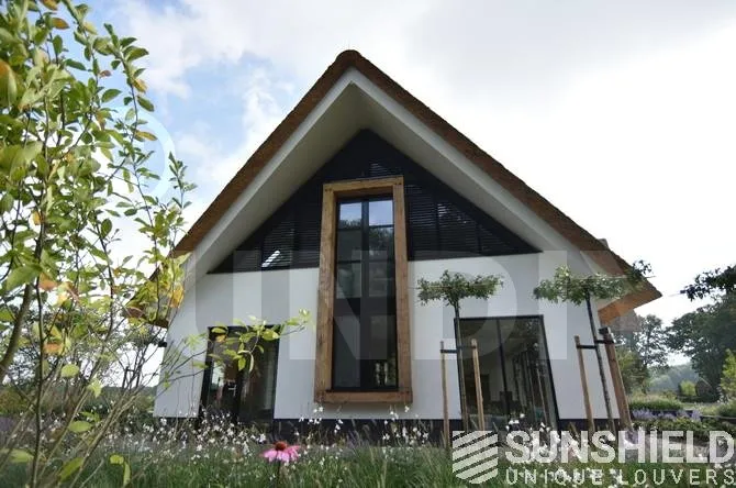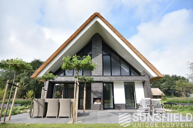 Dwingeloo se situe à peu près au cœur de Drenthe. Voici les pignons latéraux droit et gauche et la façade d’une villa rurale équipée de systèmes de persiennes. Par Sunshield.