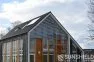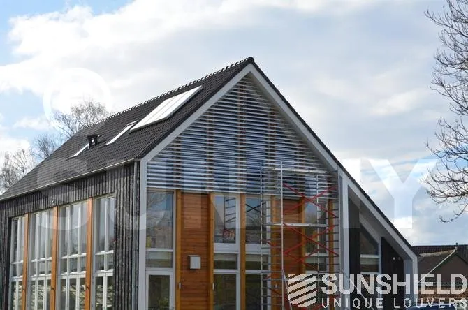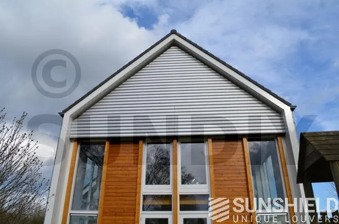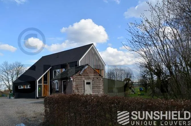 Ce projet a été réalisé avec des persiennes 145-E sur la face avant et la face arrière de cette maison de campagne moderne. Le traitement de surface est anodisé naturel.