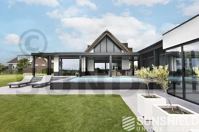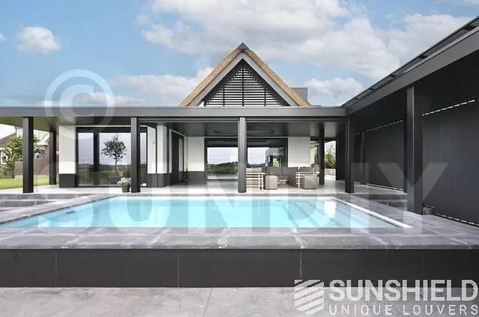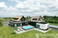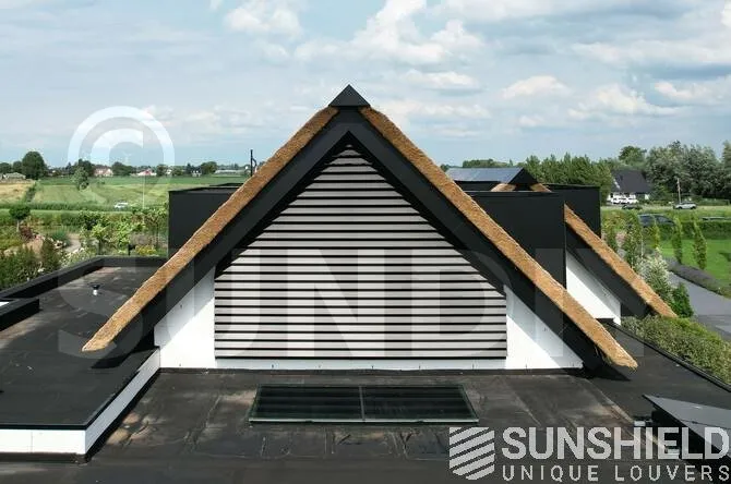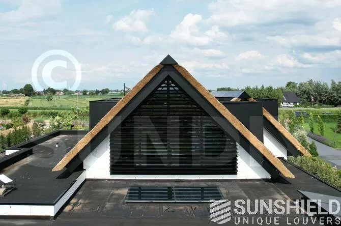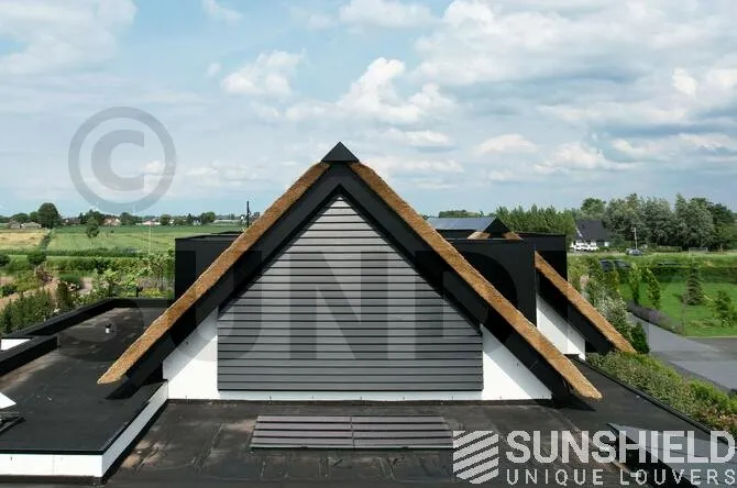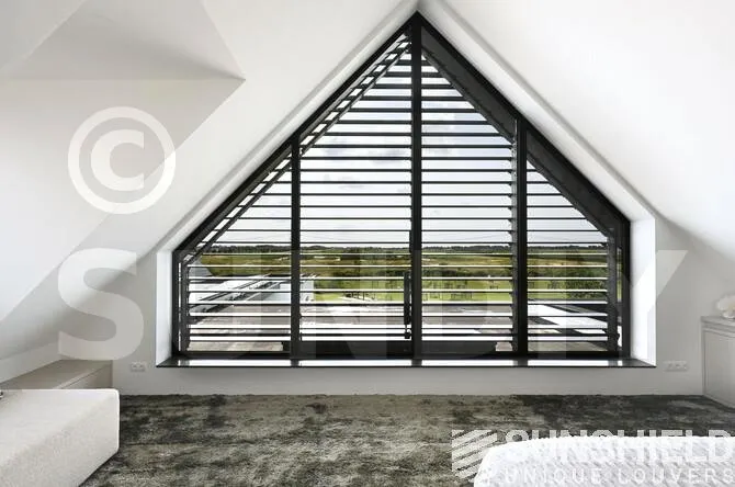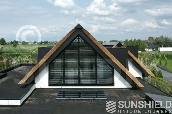 Le système de persiennes commence à la base sous la forme d’un rectangle. Vu de l’extérieur à droite, le système se transforme en triangle au bout d’un mètre environ, à gauche au bout d’un mètre et demi. Sunshield fournit des lames mobiles de n’importe quelle forme.