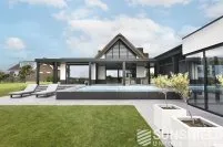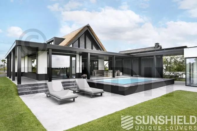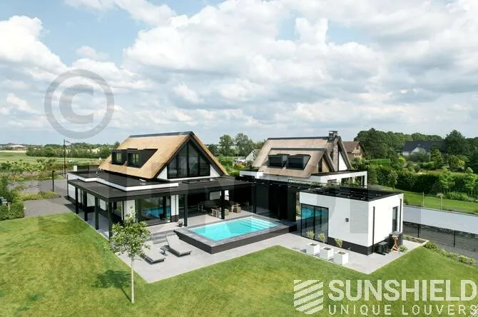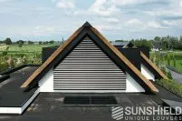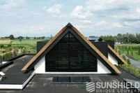 La surface totale du système d’ombrage est supérieure à 14 m². Les habitants ont opté pour la persienne 150-E, une lame d’une largeur de 150 mm. Lorsque les persiennes sont complètement ouvertes, il y a une vue de 14 cm entre les lattes.