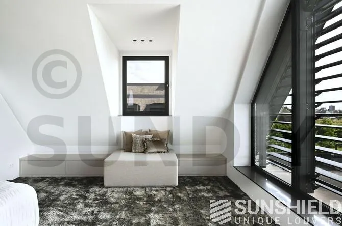 Un système de persiennes à lattes mobiles a été installé dans la chambre principale.
