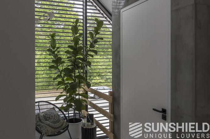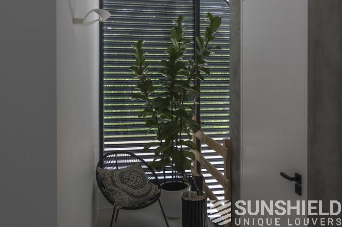 Les résidents ont opté pour la persienne 96-E. Une lame d’une largeur de 96 mm. Cette persienne a un pas de 90 mm. Cela signifie que lorsque les lames sont ouvertes, vous avez une vue de 90 mm entre les persiennes.