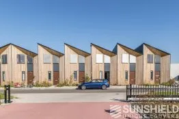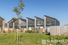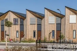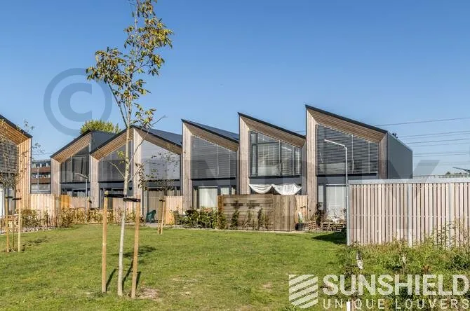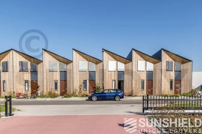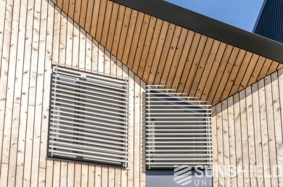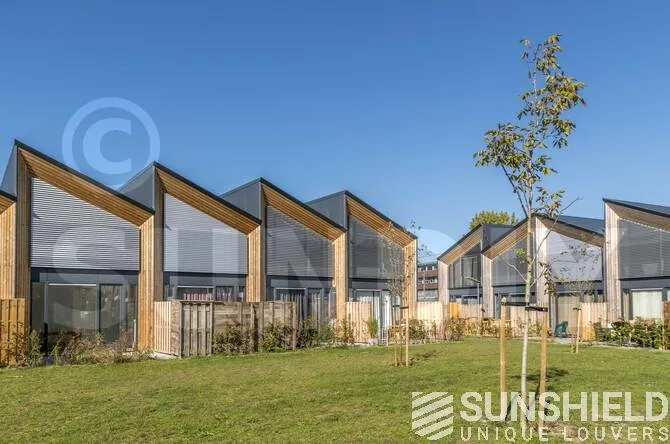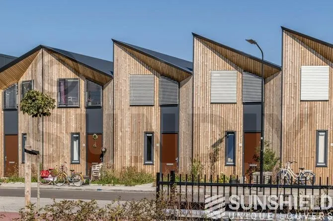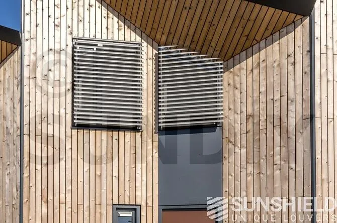 Les pièces en plastique sont fabriquées en gris clair. Les systèmes de persiennes entièrement gris offrent un joli contraste avec le revêtement en bois.