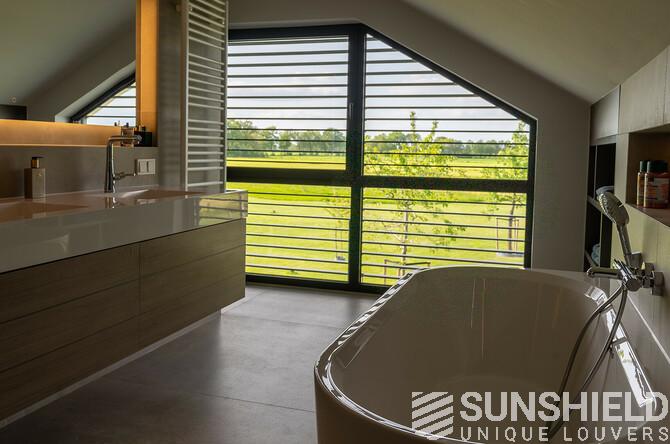 Au total, 9 systèmes de lames avec la persienne 107-E ont été installés ici, principalement aux fenêtres des chambres et des salles de bains. La persienne 107-E est une persienne qui non seulement chevauche les persiennes adjacentes, mais s’imbrique également avec ces lames. En raison de sa forme, elle est souvent utilisée en combinaison avec des brosses sur les côtés à des fins d’occultation.